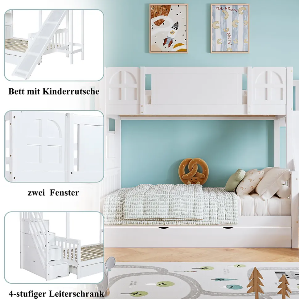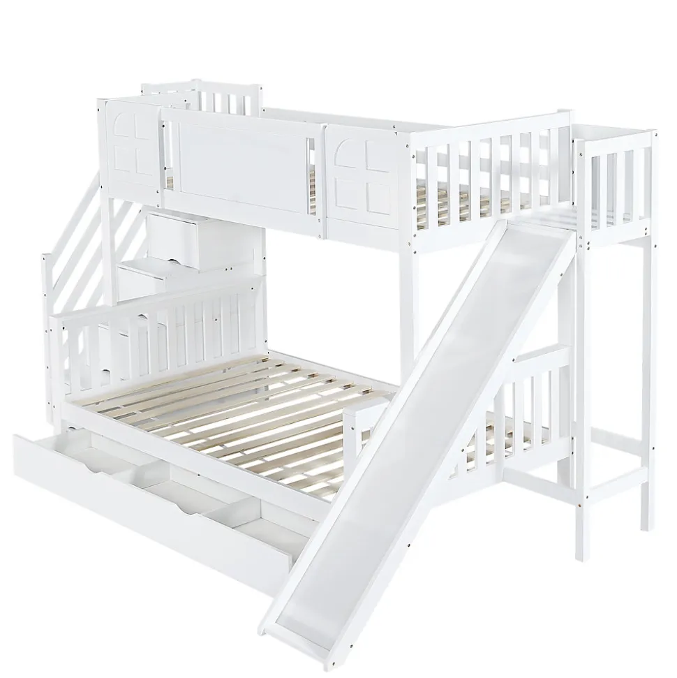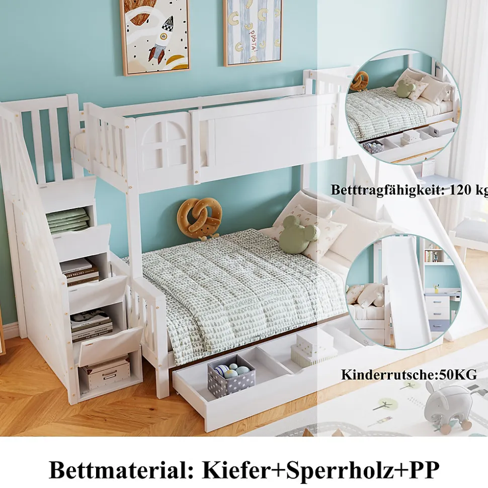 ▶ ▶ Détails ▶────────────────● Nom du produit : Lit superposé● Dimensions totales : 295 × 125 × 168,5 cm● Couleur : Blanc● Nombre de colis : 5● Capacité de charge : Lit: 120 kg, Toboggan pour enfants: 50 kg● Matériau : Pin + MDF + Contreplaqué● Dimensions du lit : 90 × 200 cm● Poids du produit : 121,5 kg● Matelas compatibles (non inclus) : 90 × 200 & 120 × 200 cm (épaisseur ≤ 11 cm)● Structure interchangeable de gauche à droite : Non► Remarques ►※ Le produit est livré en 5 colis, qui peuvent ne pas arriver simultanément. Veuillez faire preuve de patience.※ En raison de mesures manuelles, des écarts de 2 à 3 cm peuvent survenir.※ La couleur peut légèrement différer entre l’image et le produit réel à cause de la lumière. Veuillez vous référer au produit reçu.※ Si vous avez des questions lors du montage, contactez-nous rapidement.