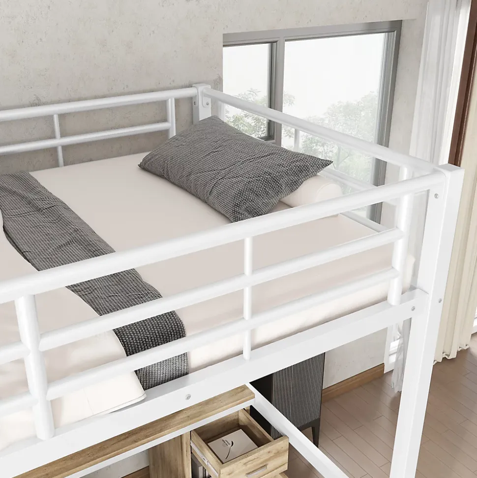 Ce lit superposé en métal est une solution complète pour les espaces restreints. Il intègre un espace de couchage, un bureau et un placard de rangement dans une seule structure robuste et élégante.Le cadre en métal blanc associé à des panneaux en MDF effet bois crée une atmosphère moderne et chaleureuse. Idéal pour les enfants comme pour les adolescents.Points forts :Zone de travail et armoire intégréesEscalier à 4 marches sécuriséStructure robuste et stableRangement spacieux sous le litDesign sobre, facile à assortirDimensions & poids :Dimensions totales : 204x149x180 cmHauteur sous le lit : 149,5 cmPoids total : 76,5 kgMatelas recommandé : 90×200 cm (épaisseur ≤10 cm)Charge maximale : lit 120 kg / bureau 40 kg / armoire 40 kgCaractéristiques :Matériaux : Métal + MDFLattes : métalCouleur : Blanc + Bois naturelÀ monter soi-mêmeNombre de colis : 3