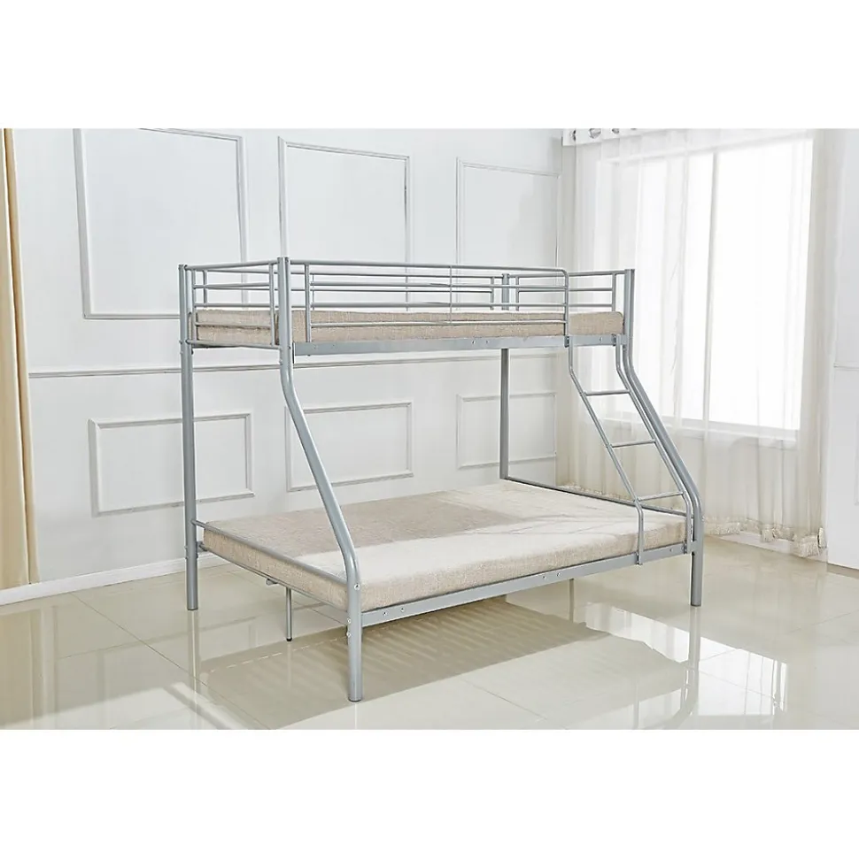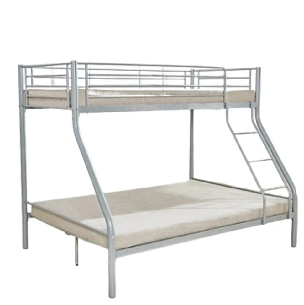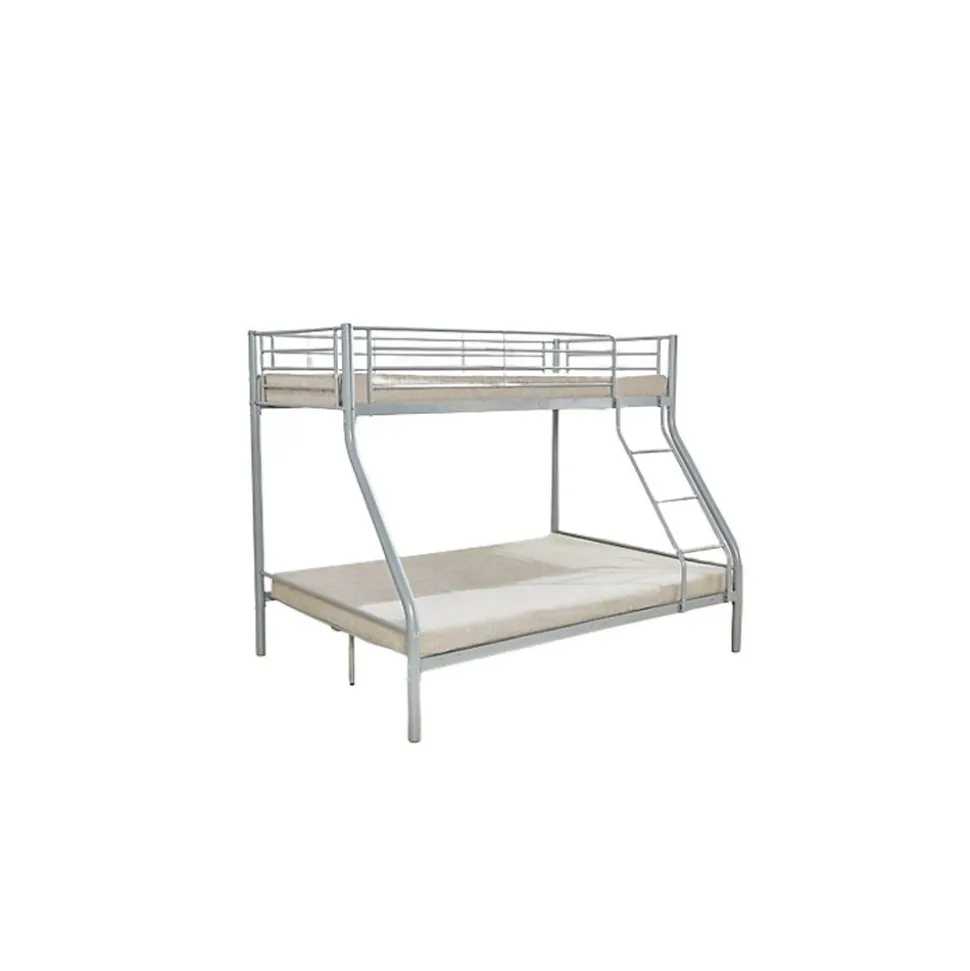 Lit superposé TRYO – 3 places – Métal gris – Sommier inclusLe lit superposé TRYO est la solution idéale pour optimiser l’espace tout en offrant un confort maximal. Avec un couchage supérieur de 90×200 cm et un couchage inférieur de 140×200 cm, ce lit est parfait pour une chambre d’enfant, d’adolescent ou une chambre d’amis. Sa structure en métal robuste de 50 mm garantit une stabilité optimale et une durabilité accrue.Caractéristiques du produit :Type de produit : Lit superposé 3 placesCollection : TRYODimensions : L210 cm x H160 cm x P145 cmHauteur sol/1er lit : 27 cmEspace entre les deux lits : 91 cmMatériau : Structure en tube de métal (épaisseur 50 mm)Coloris : GrisStyle : ClassiqueType de sommier : Sommiers inclusMatelas : Non inclusMontage : Assemblage facile avec notice fournieAvantages du lit superposé TRYO :Gain de place : Idéal pour optimiser l’espace tout en offrant deux couchages confortables.Robustesse : Sa structure en métal de 50 mm garantit stabilité et résistance sur le long terme.Design moderne : Son coloris gris et son style classique s’intègrent facilement dans tous types d’intérieurs.Pourquoi choisir le lit superposé TRYO ?Pratique et fonctionnel : Une solution idéale pour les familles, les chambres d’amis ou les locations saisonnières.Facilité d’entretien : La structure métallique est simple à nettoyer et résistante aux chocs.
