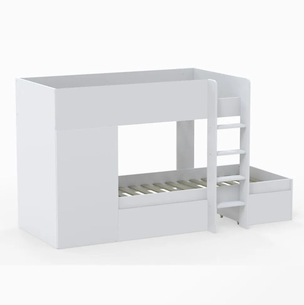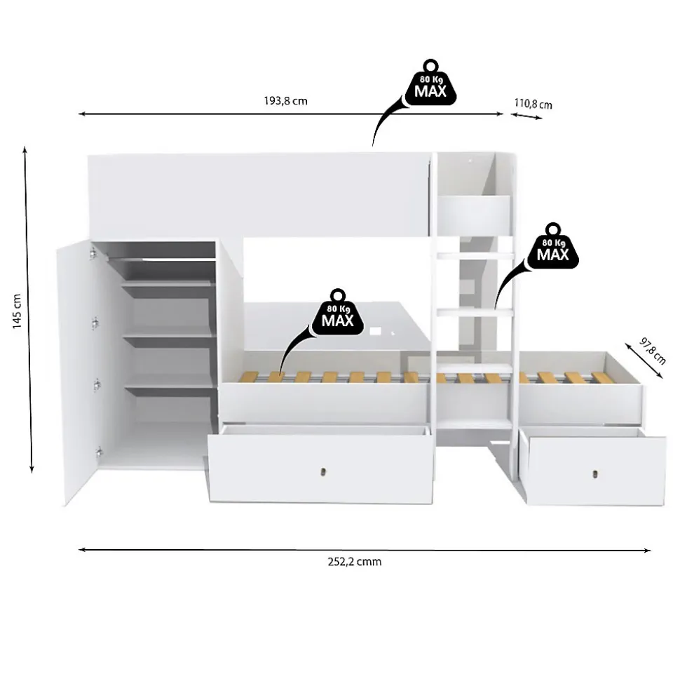 Lit superposé TWIN 90 x 190 cm avec armoire et 2 tiroirs de rangementStructure en panneau de particules.Finition : Blanc2 couchages de 90×190 cm2 sommiers à 14 lattes en épicéa2 tiroirs de rangement et armoire intégrée avec 1 penderie et 3 tablettes.Petit(s) tiroirs : 56 x 29 x 49 cm – Intérieur 52 x 18 x 46 cmGrand(s) tiroirs : 94 x 29 x 49 cm – Intérieur 90 x 18 x 46 cmEchelle non réversible.Poids net : 144 kgPrécautions à prendre :* Charge maximale d’utilisation : 80 kgs* Age minimum d’utilisation : 6 ans* Hauteur maximale de matelas conseillée pour le couchage du haut : 14 cmConseils d’entretien: Ne pas utiliser de produit solvant, diluant ni abrasif.Livré démonté avec sommiers et sans matelas ni accessoires de décoration. A monter soi-mêmeDimensions:252x111x145