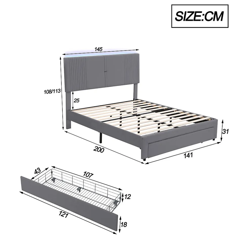 Lit double multifonctionnelCe lit tapissé dispose de bandes LED, de ports USB et de tiroirs extra-larges. Ce lit classique en tissu velours doux pour la peau est parfait pour les adultes et adolescents et peut également être utilisé comme lit d’invité.Lit avec tiroirsCe cadre de lit en tissu comprend un grand tiroir coulissant (avec 4 roulettes sous le tiroir), idéal pour le rangement à la maison. Espace de rangement caché avec grande capacité, à la fois esthétique et pratique.Solide et durableLa structure interne en acier est robuste et durable. Le lit est également équipé d’un rembourrage en mousse haute densité. La combinaison du cadre en acier et du coussin en mousse offre un sommeil calme, doux et confortable.Avec bande LED et ports USBLa table de chevet est équipée d’une bande LED et de 2 ports USB. La bande LED peut être contrôlée via smartphone ou télécommande. De plus, la hauteur de la table de chevet peut être ajustée pour s’adapter à différents matelas. Ce lit tapissé est pratique, confortable et ludique.Montage facileLes dimensions totales du produit sont de 200 x 145 x 108 (113) cm. Tous les éléments nécessaires sont emballés dans 2 colis express et livrés directement à votre domicile ; toutes les pièces, outils et instructions sont inclus. L’installation peut être réalisée facilement par deux personnes en moins d’une heure.