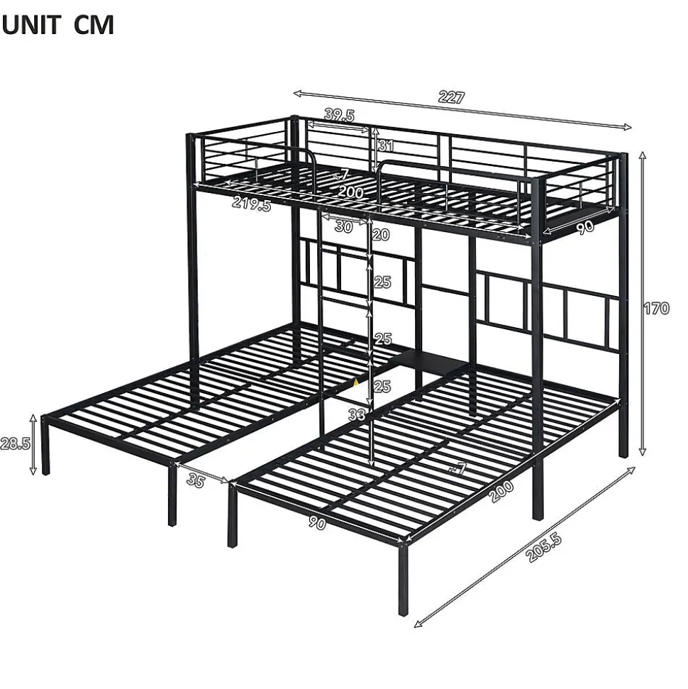 Lit superposé triple 90×200 cm (noir métal)Caractéristiques principalesDimensions : 227×205,5×170 cmMatériau : Métal robusteCapacité : 3 couchages indépendantsSécurité : Barrières hautes + échelle 4 marchesNorme : Certifié EN 747 (sécurité européenne)Poids : 60 kgLivraison en 3 colis102,9×37,6×14 cm (25 kg)123,2×38,1×15,2 cm (18,7 kg)185,9×38,1×10,2 cm (22 kg)Points fortsStructure métallique ultra-stablePlateau de rangement intégréÉchelle sécurisée à angle droitConvient pour familles nombreusesMontage facile avec noticeInformations complémentairesOrigine : VietnamCharge max par lit : 100 kgMatelas 90×200 cm non inclus (13 cm max)Hauteur libre sous lit : 28,5 cmSolution pratique pour chambres partagées