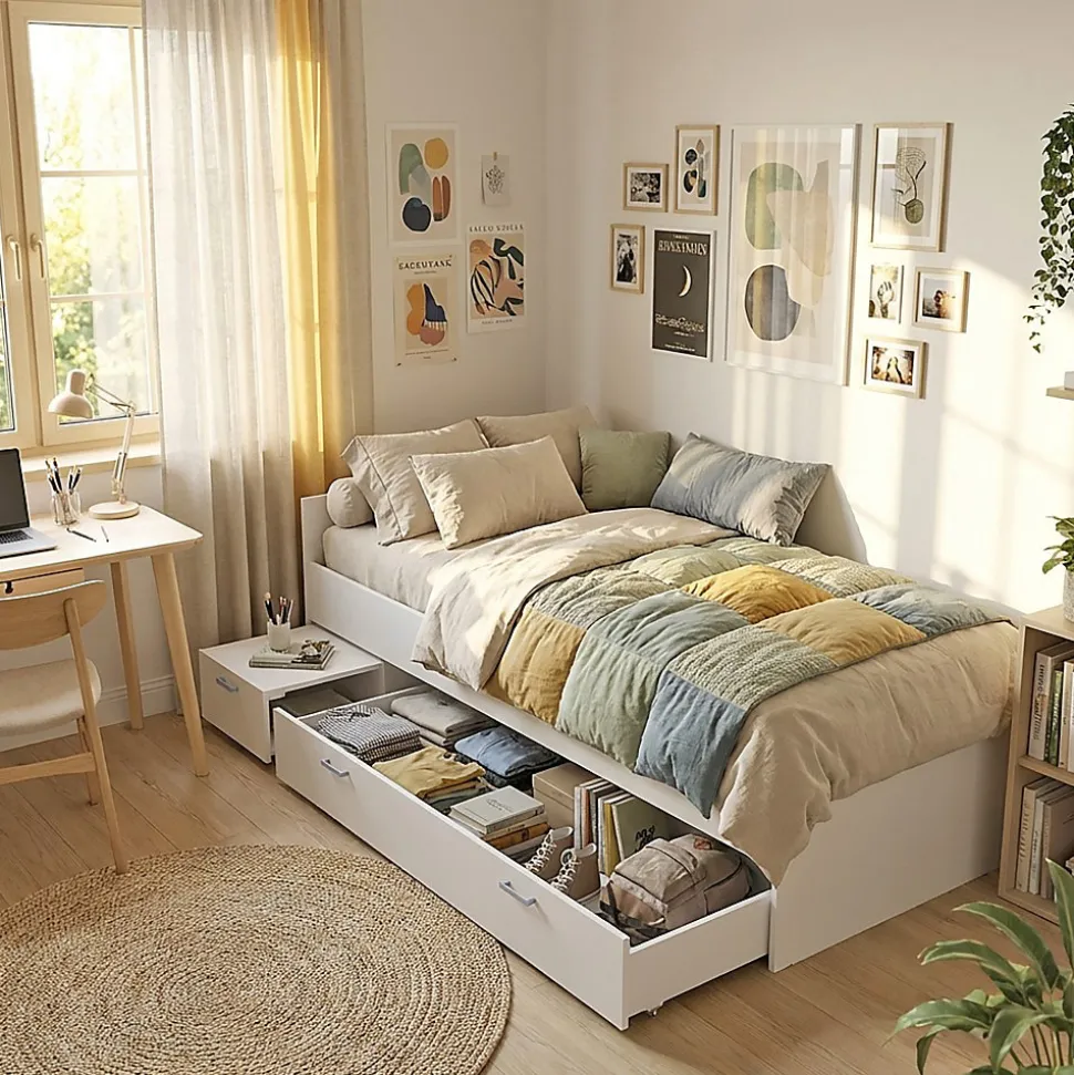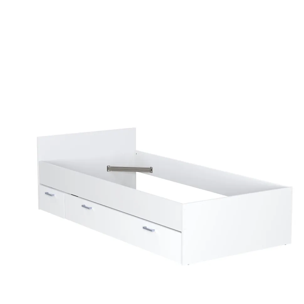 Lit TWIST 90×190 + chevets + tiroir / BlancLe lit Twist apporte à la chambre un côté confortable et pratique. Composé de 1 grand tiroir, il permet d’optimiser facilement le rangement dans l’espace nuit. Il dispose même d’une table de chevet montée sur roulettes que l’on peut glisser sous le lit en un clin d’œil pour libérer de l’espace dans la pièce ! Grâce à son design sobre et épuré, le lit Twist est un intemporel qui conviendra aux petits comme aux plus grands et à tous les styles de décoration.Caractéristiques : – Structure en panneau de particules- Finition : blanc- Dimensions chevet : L40xP39xH21 cm – dimensions intérieures : L40XP33xH15 cm- Dimensions tiroir : L150xP39xH21 cm -dimensions intérieurs : 146x33x16 cmLivré démonté sans sommier et sans matelas, prévoir un sommier à cadre. A monter soi-mêmeDimensions:194x94x65 cm