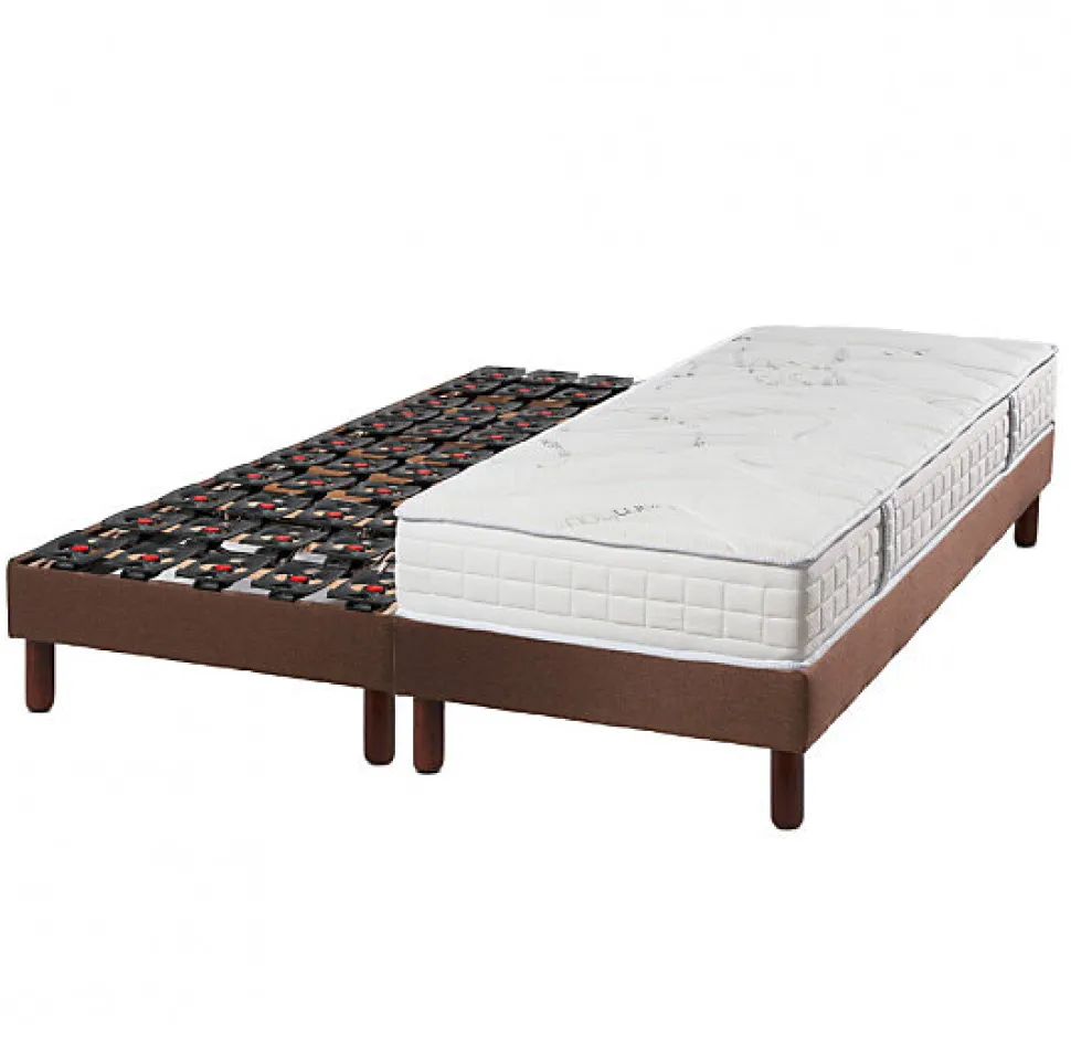 L’Ensemble :Cet ensemble contient un sommier composé de 10 rangées de plots multipositions dont 4 rangées réglables en fermeté pour la zone épaule et bassin. Il est équipé de deux moteurs Limoss 6000N fonctionnant avec télécommande filaire. Le matelas Classic Ressorts est composé de 740 ressorts ensachés recouverts d’une couche de mousse pour un accueil agréable. Le coutil est déhoussable, traité anti-acariens et anti-allergique.Le Sommier Hauteur du sommier : 14cmChassis BoisCaisse :- Cadre composé en pin massif, hauteur 14 cm- 1 traverse 50x20mm en hêtre massif avec inserts M8, 4 masses d’angle avec inserts M8- Partie amovible en multiplis, section 50×20, papier décor gris foncé métallisé kornraster- Finition caisse: papier décor WengéSuspension plots :- Suspension, 10 rangées plots TPE (Elastomère thermoplastique) dont 4 rangées (2+2) réglables dur.soft, plots montés sur traverse droite- TPE, matière à mémoire interactive qui, quelque soit la position de votre corps, renvoie une même force de soutien et reprend indéfiniement sa forme initiale (matère mémorisante apportant élasticité et longévité)Couchage :- Cinématique 5 plans à découpe morphologique assurant le soutien simultané du dos et des cuisses- Matelas préconisé : matelas ressorts spécifique literie électrique ou matelas latex, mousse épais spécifique literie electriqueMoteur:- Système 2 moteurs Limoss par sommier- Puissance 2×4