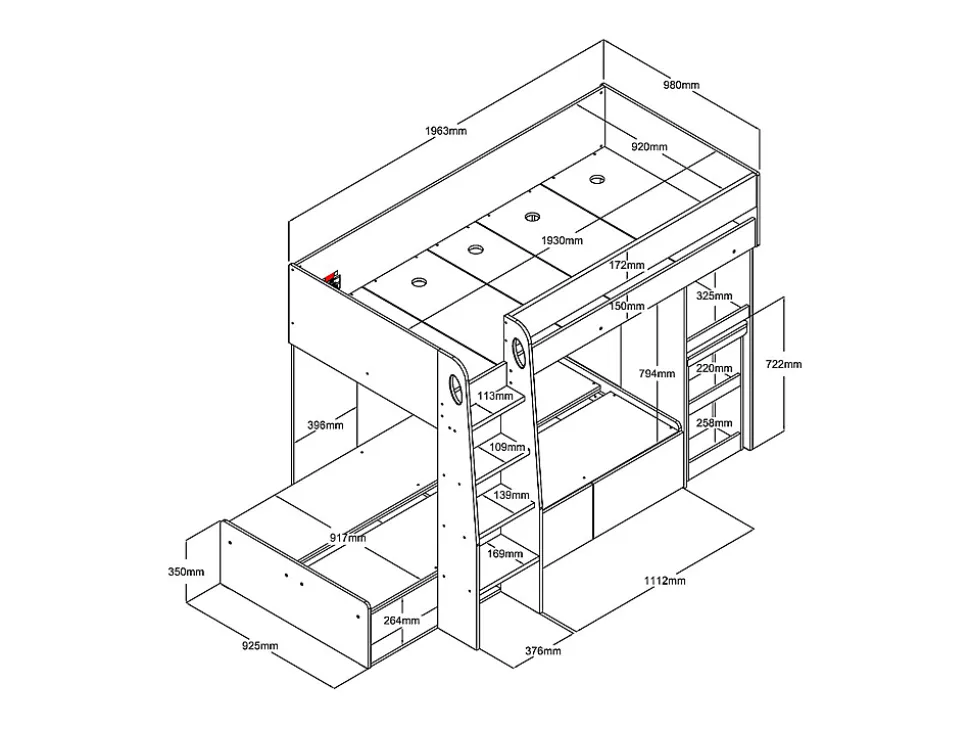 Transformez la chambre de vos enfants en un espace multifonctionnel et optimisé grâce au lit superposé LOMIDEN. Il dispose de 2 couchages, 1 bureau extensible ainsi que des rangements astucieux avec 2 tiroirs et 4 niches. Caractéristiques Couleur (nuance) : Blanc, Naturel clair Matière (précision) : Panneau de particule Taille (couchage) : 90 x 190 cm Nombre de places : 2 places Sans matelas Avec sommier Type de sommier : Sommier plein en panneau Avec bureau Type de rangement : 2 tiroirs, 4 niches Tiroir coulissant Charge maximale supportée : 80 kg À monter soi-même : Bureau sur roulettes : Ce lit est compatible avec tous les matelas 90×190 cm : Attention, le lit ne convient pas aux enfants de moins de 6 ansDimensions Longueur : 196.3 cm Hauteur : 150 cm Profondeur : 117.5 cm, 184.3 cm Hauteur de couchage : 117.5 cm Hauteur entre les lits : 79.4 cm Hauteur de la barrière de sécurité : 40 cmLivraisonLors de la livraison, il est conseillé de vérifier que le bon nombre de colis a été livré.ColisColis n°1 : Longueur 207 cm, Largeur 49 cm, Hauteur 10 cm, Poids 39 kg. Colis n°2 : Longueur 168 cm, Largeur 54 cm, Hauteur 10 cm, Poids 32 kg. Colis n°3 : Longueur 128 cm, Largeur 98 cm, Hauteur 8 cm, Poids 46 kg. Colis n°4 : Longueur 113 cm, Largeur 45 cm, Hauteur 20 cm, Poids 45 kg.