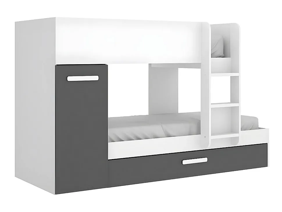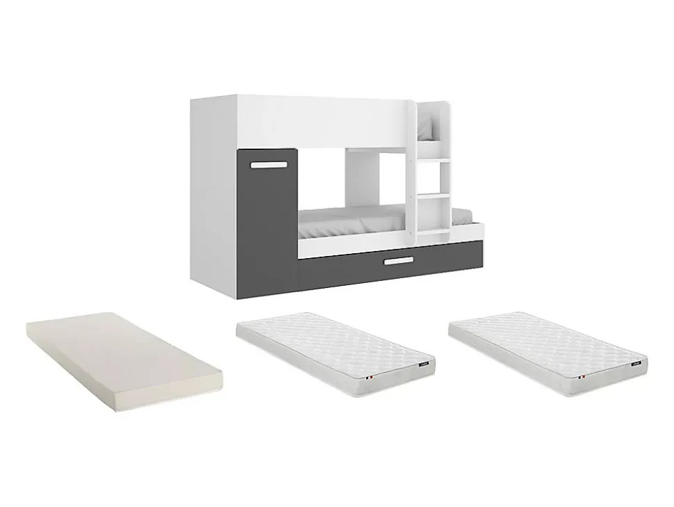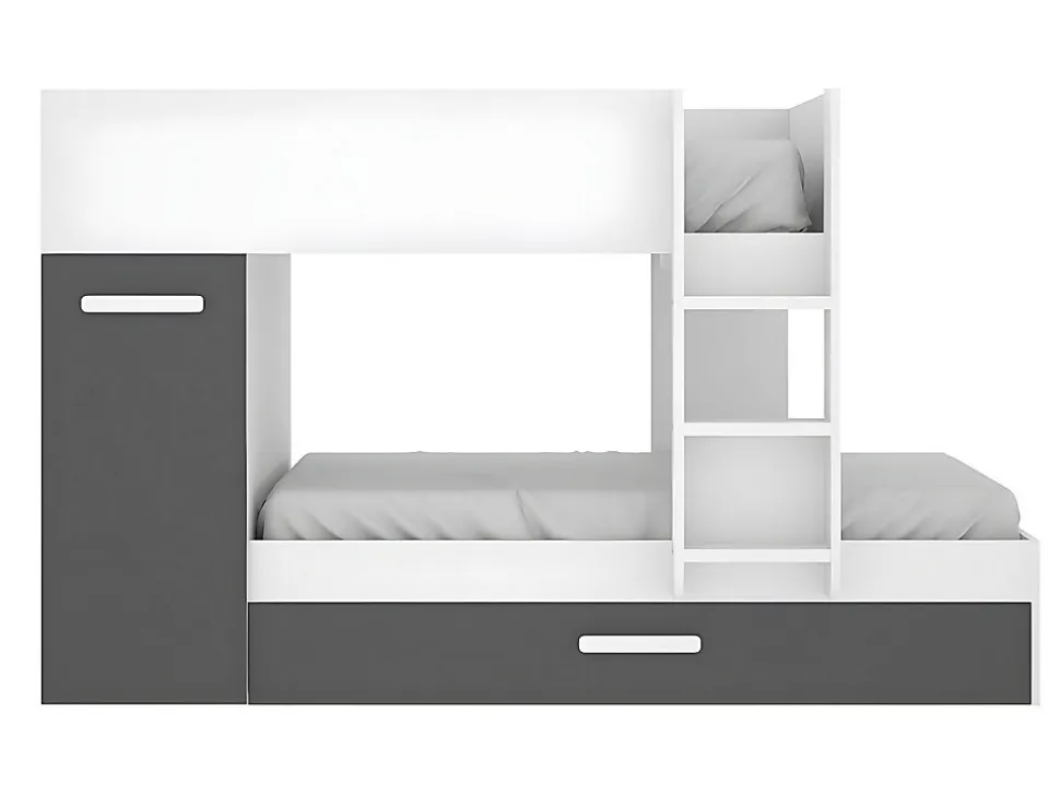 - Lits superposés ANTHONY 3 x 90 x 190 cm – Armoire et tiroir lit gigogne – Sommiers et matelas inclus – Structure : Panneaux de particules – Coloris : Blanc et anthracite – Dimensions : L243 x P97 x H150 cm – Craquez pour la praticité avec le lit ANTHONY