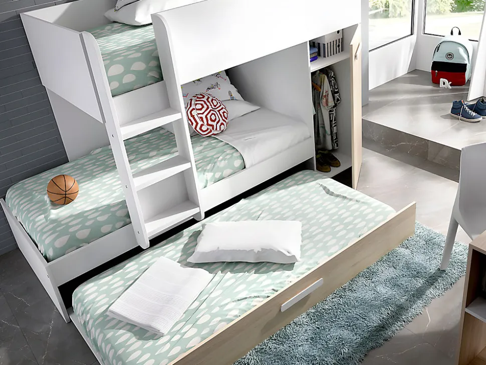 - Lits superposés ANTHONY 3 x 90 x 190 cm – Armoire et tiroir lit gigogne. Sommiers et matelas inclus. Structure : Panneaux de particules. Coloris : Blanc et chêne. Dimensions : L243 x P97 x H150 cm. Craquez pour la praticité avec le lit ANTHONY !