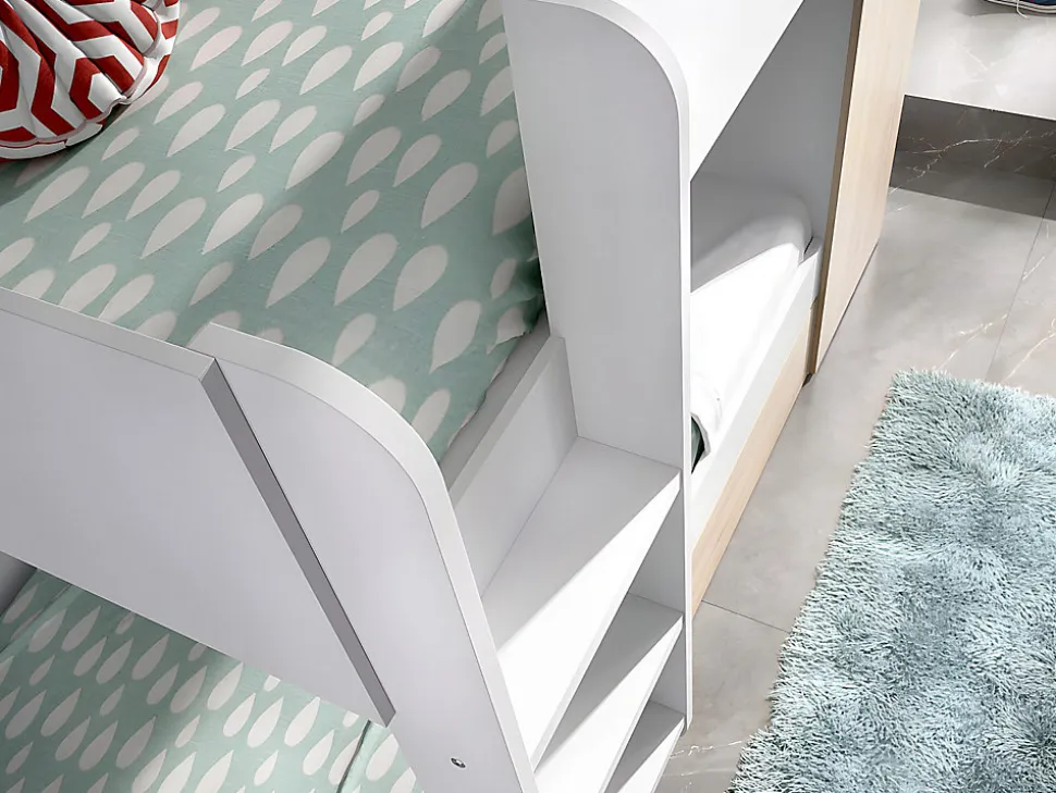 Le lit ANTHONY « tout en un » est idéal pour libérer de la place dans la chambre de vos enfants. Il pourront ranger leurs affaires dans l’armoire, ainsi qu’inviter leurs amis à dormir à la maison avec le lit tiroir gigogne. La structure bicolore apportera du pep’s et du raffinement à la chambre de vos enfants, filles ou garçons !1 x Lit superposé ANTHONYCaractéristiques Couleur (nuance) : Blanc, Naturel clair Matière (précision) : Panneau de particule Finition : Mélaminé Taille (couchage) : 90 x 190 cm Nombre de places : 2 places Réversible Avec sommier Type de sommier : Sommier plein en panneau Type de rangement : Placard, Penderie Nombre de placards : 1 Gamme : Good for Planet, Création Exclusive Produit : Fabriqué en Europe Charge maximale supportée : 75 kg À monter soi-même : Armoire intégrée (1 barre de penderie et 1 étagère) : 1 tiroir lit gigogne 90 x 190 cm sur 8 roulettes : Le lit peut être monté vers la gauche ou vers la droite : Attention le lit haut ne convient pas aux enfants de moins de 6 ans : Le lit est compatible avec tous les matelas 90 x 190 cmDimensions Longueur : 243 cm Hauteur : 150 cm Profondeur : 97 cm Hauteur entre les lits : 88 cm Hauteur de la barrière de sécurité : 16 cm Hauteur sous le couchage du haut : 115 cm Hauteur sous le couchage du bas : 24 cm Hauteur entre les 2 couchages : 88 cm Dimensions de l’armoire : L50 x P97 x H110 cm Hauteur maximale des matelas : 19 cm Hauteur maximale du matelas gigogne : 15 cm2 x Matelas classique ZEUSCaractéristiques Technologie (âme) : Mousse Soutien : Ferme Densité (âme) : 25 kg/m³ Technologie matelas (accueil) : Mousse de confort Densité (accueil) : 20 kg/m³ Accueil : Tonique Garnissage du matelas : Ouate hypoallergénique Densité (garnissage) : 400 g/m2 Coutil (matière) : Polyester Couleur (nuance) : Blanc Matière (précision) : 45 % Polyester Composition % tissu Polypropylène : 55 % Taille (couchage) : 90 x 190 cm Nombre de places : 1 place Traitement : Anti-acariens,