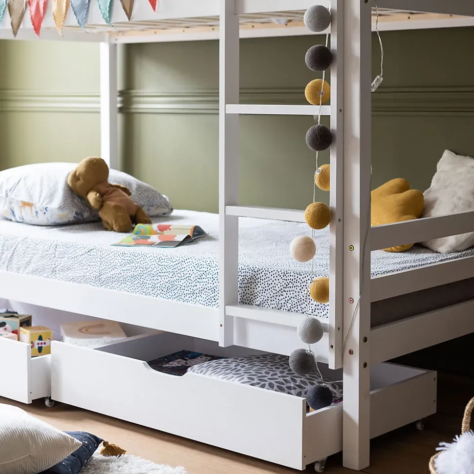 Tiroirs de rangement intégrés : Deux tiroirs pratiques pour linge, jouets ou accessoires., Sommier inclus : Lattes en contreplaqué fournies pour chaque couchage., Sécurité renforcée : Barrière haute et conformité à la norme EN 747-1.