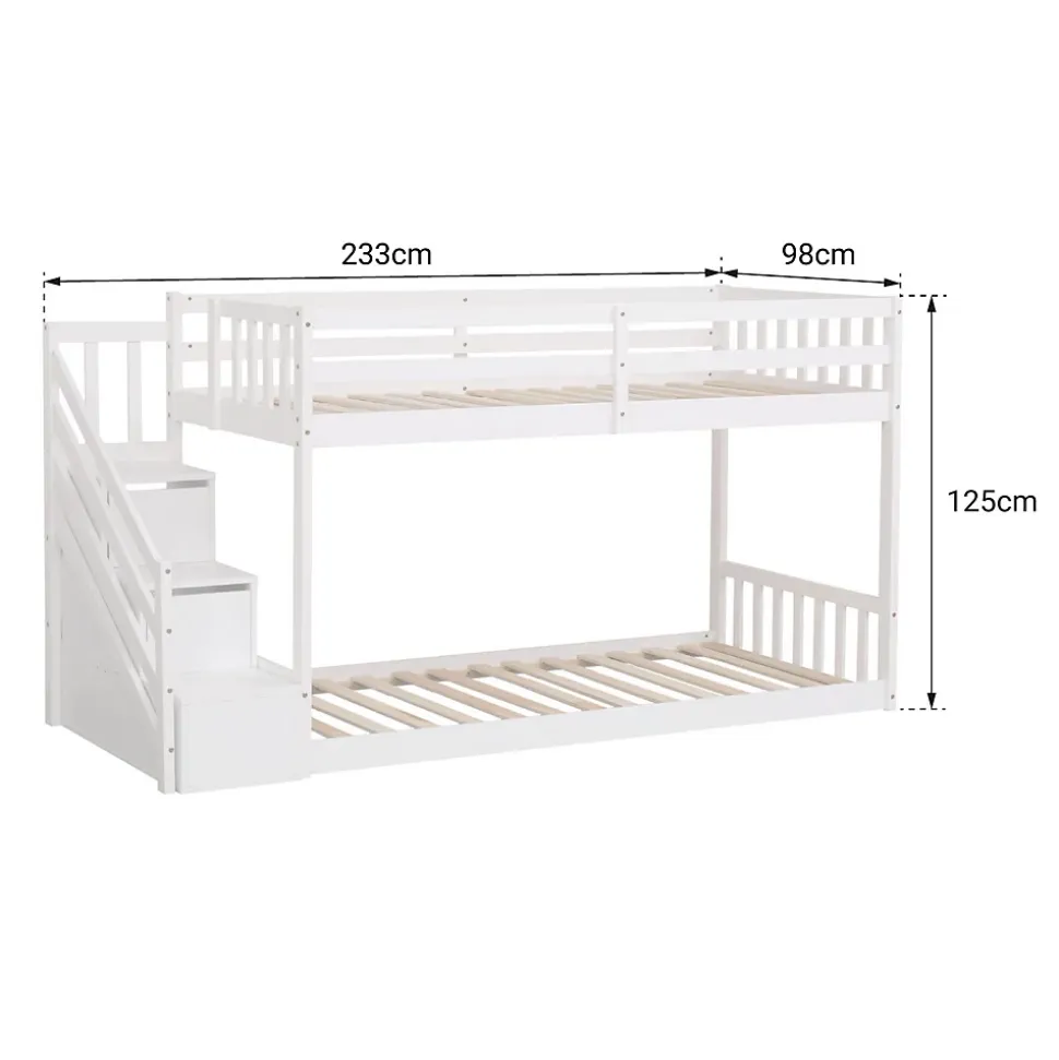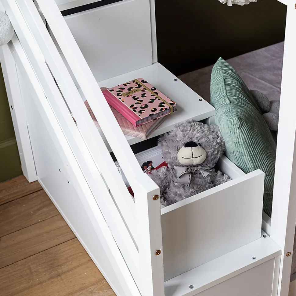 Agencement maline 2-en-1 : Grâce à ses 2 couchages superposés, ce lit optimise l’espace d’une chambre à coucher pour accueillir 2 enfants dans une même pièce., Sécurité et accès soignés : L’escalier latéral avec rambarde facilite la montée en toute confiance tandis que la barrière latérale protège efficacement le couchage., Rangement pratique intégré : 2 tiroirs logés dans les marches offrent un stockage pratique pour livres et jouets sans encombrer la chambre.