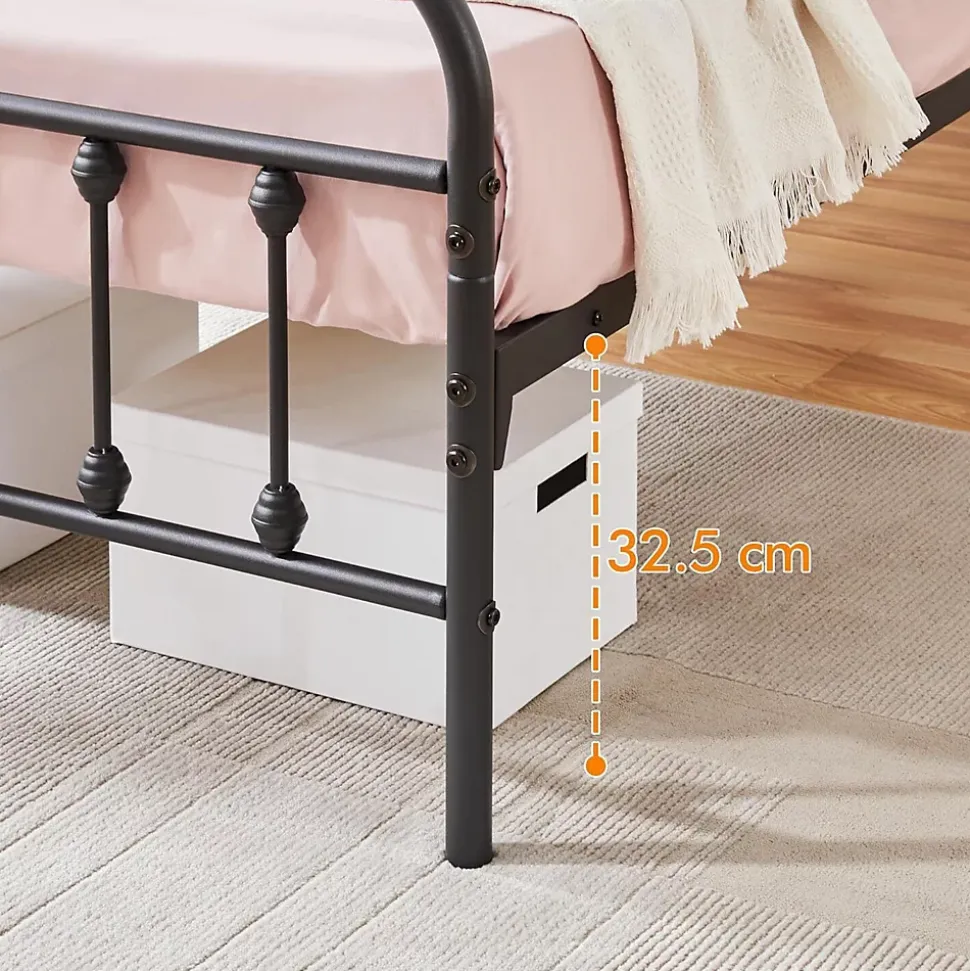 Lit simple standard – Ce lit en métal mesure 207,5 x 95,5 x 102,5 cm pour un matelas de 200 x 90 cm. Vous pouvez utiliser le matelas avec mousse à mémoire de forme, latex ou matelas à ressorts.Stable et stable : ce lit en métal est composé d’un sommier à lattes robuste, d’une tête et d’un pied de lit hauts et de 6 pieds en métal solides. Avec une capacité de charge jusqu’à 136 kg, ce cadre de lit est adapté pour un usage quotidien.Tête haute et pied de lit – Il y a suffisamment d’espace entre la tête et le pied et la surface de couchage. La tête et le pied de lit hauts permettent aux différentes épaisseurs de matelas, ce qui vous permet de choisir le confort optimal.Profondeur d’insertion raisonnable – Entre le sommier à lattes et les parties latérales du lit, il y a suffisamment d’espace pour votre matelas. La profondeur d’insertion appropriée garantit que le matelas ne glisse pas.Construction robuste : ce lit en métal est composé d’un cadre en métal massif, de pieds en métal solides et d’un sommier à lattes robuste. Le sommier à lattes offre une surface de couchage stable pour le matelas de différentes épaisseurs.