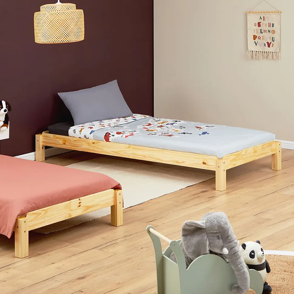 Les lits superposables Rino … sont idéals pour les petits espaces car vous pouvez empiler les lits les uns sur les autres. Si vous avez des invités pour la nuit, séparez simplement les lits et disposez d’un espace de couchage 1 place supplémentaire. Fabriqués en pin massif, ces lits superposables sont solides et apportent un charme classique à votre chambre. Ces lits sont légers et très faciles à empiler, le lit du haut s’emboîte simplement sur celui du bas, au niveau des pieds. Description des matériaux : – Le cadre de lit est fabriqué en pin massif, vernis naturel. – La madrure du bois reste visible. Caractéristiques du produit : – Lot de 2 lits simples superposables – Couchage 1 place : 80 x 190 cm – Hauteur de matelas recommandée : 15 cm – Sommier et matelas non inclus Livraison et montage : – Contenu de la livraison : lot de 2 lits, sans décoration, notice de montage – Le produit est livré en pièces détachées – Assemblage facile grâce à la notice – Sans sommier et sans matelas – Photo non contractuelle Résumé: – Hauteur cadre de lit: 12 cm – Convient uniquement avec: Sommier fagot à lattes – Sommier: vendu séparément – Surface: Lasuré, La madrure du bois reste visible – Dimensions monté: 54 x 88 x 201 cm (H x L x L) – Couchage: 80 x 190 cm – Couleur: Naturel – Matériel: Pin massif