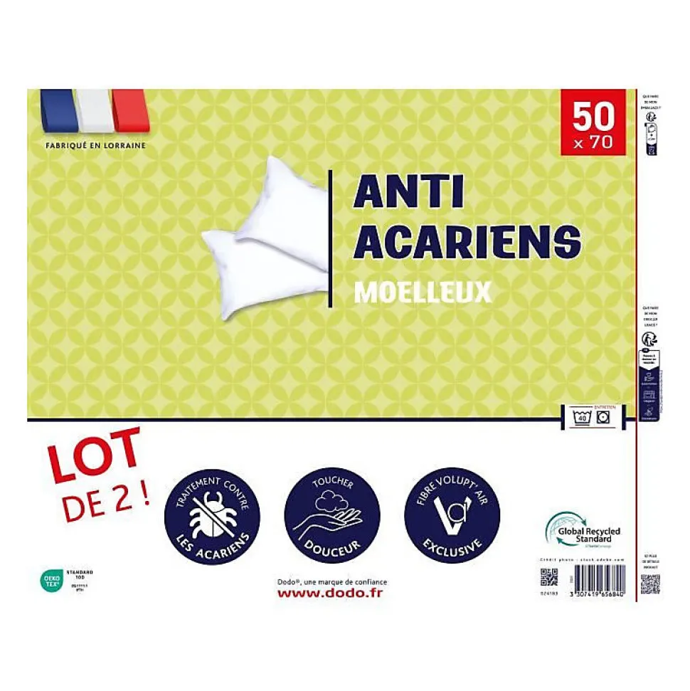Lot de 2 Oreillers anti-acariens 50/70 cm, enveloppe 100% polyester traitée anti-acariens et garnissage 100% polyester fibre creuse siliconée VOLUPT’AIR pour un confort moelleux et un sommeil sain.