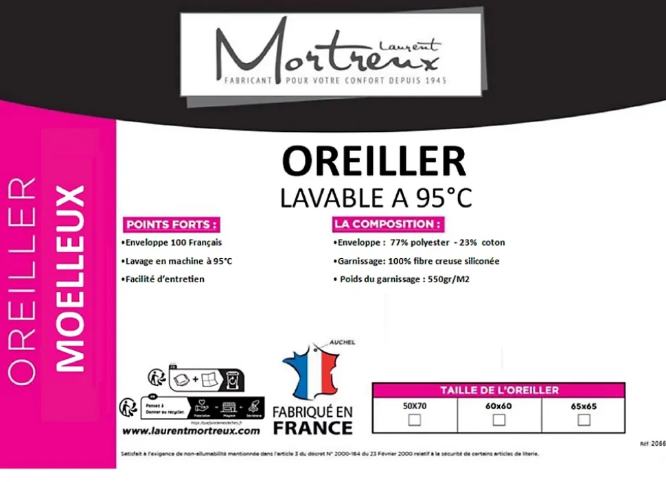 2 x Oreiller blanc 50x70Oreiller blanc soufflé Vendu avec sa housse de rangementGarnissage : 550 grs par m² de fibre creuse siliconnée « Sensifibre »Tissu polycoton : 23% coton + 77% microfibreLavable à 95°Pas de séchage tambourPas de repassagePas de nettoyage à secFabrication française