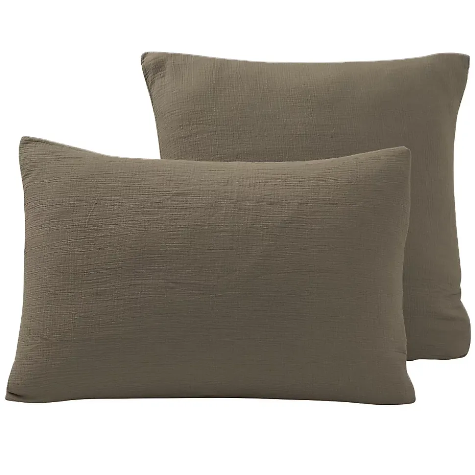 Le lot de 2 taies d’oreiller LOFT en gaze de coton est fait pour rendre vos nuits légères et remplies de fraîcheur. Ces 2 taies d’oreiller seront de véritables nuages de douceurs.Tissé en 160 gr/m², le gaze de coton est un tissus qui permet un très bon équilibre entre fraîcheur et confort, et dont l’aspect froissé conviendra aux intérieurs modernes ou plus classiques. Notre tissu est en double gaze de coton pour garantir plus de confort et de résistance.Notre linge de lit de la gamme LOFT est livré dans un pochon en tissus afin de réduire notre empreinte carbone par la réduction de l’utilisation d’emballages plastiques. Il vous sera utile comme sac de rangement ou sac à linge de voyage! Coordonnez votre linge de lit avec les draps housses et housses de couettes assortis en faisant la recherche Loft Sensei.Caractéristiques du linge de lit LOFT Sensei Maison :100% gaze de coton très fin de qualité supérieureDimensions : 50x70cm ou 65x65cmTissé en 160 gr/m²Uni avec un large choix de couleurLot de 2 taiesFacile d’entretien – Lavable en machine 40° – Séchage modéréDepuis des décennies, Sensei Maison vise à rendre vos intérieurs cocooning. Au travers de nos collections tendances, uniques et design notre ambition a toujours été de privilégier un rapport qualité/prix le plus juste.En savoir plus :Ce produit est certifié de la norme OEKO-TEX Standard 100 – Cette certification vise à garantir la non-toxicité des textiles et des colorants.