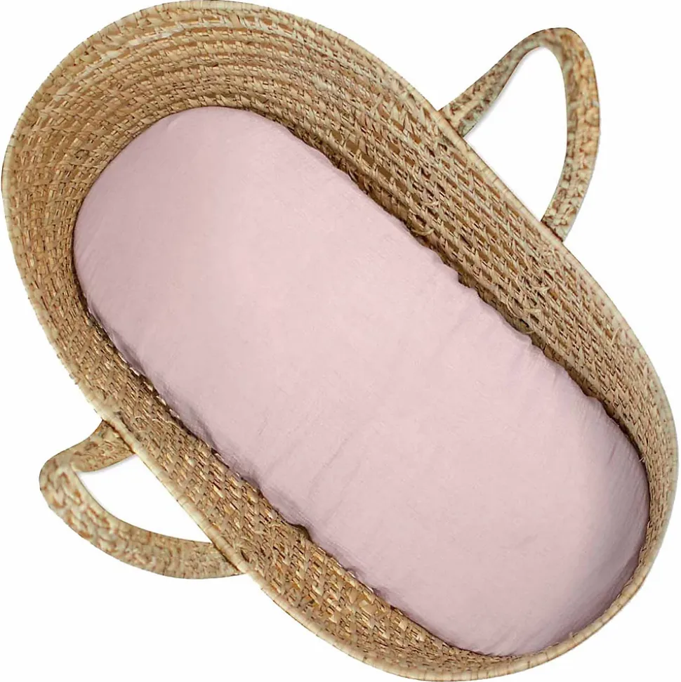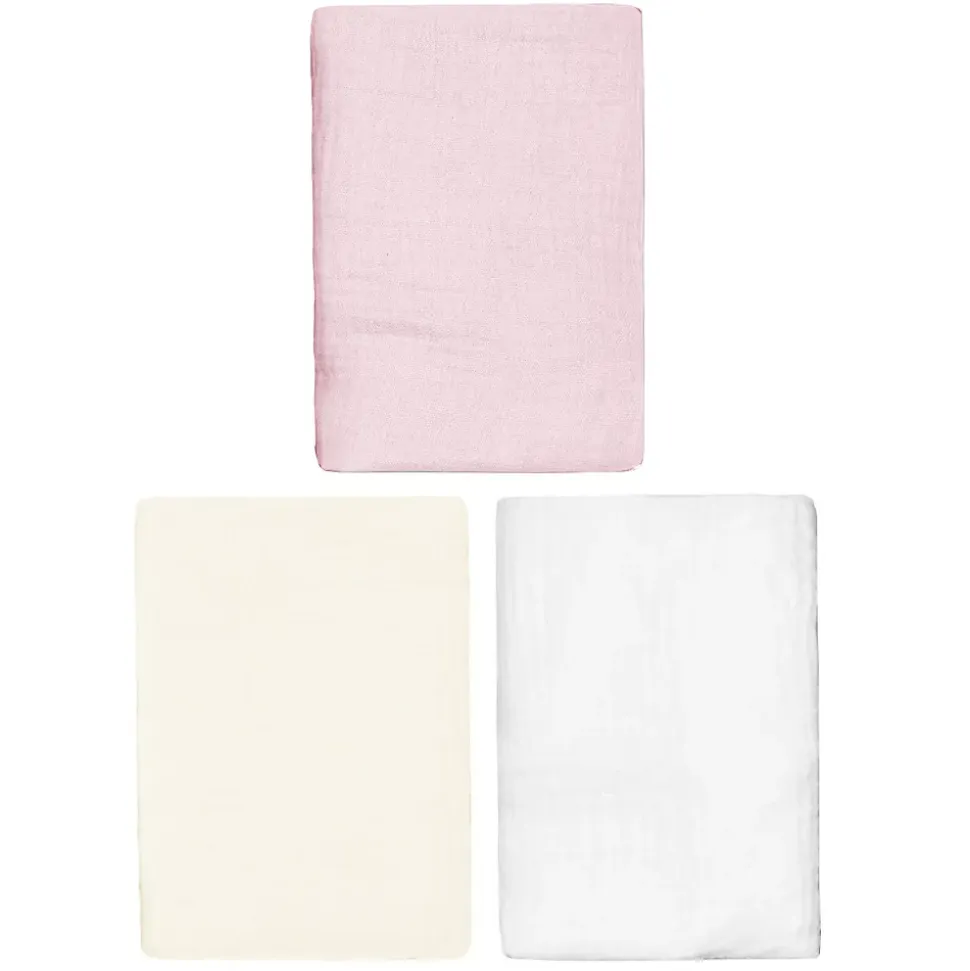 Découvrez notre lot de 3 draps housses pour couffin en double gaze de coton rose, écru et blanc. Tailles 30×70 cm, couleurs variées, fabriqués en France, certifiés OEKO-TEX et REACH.