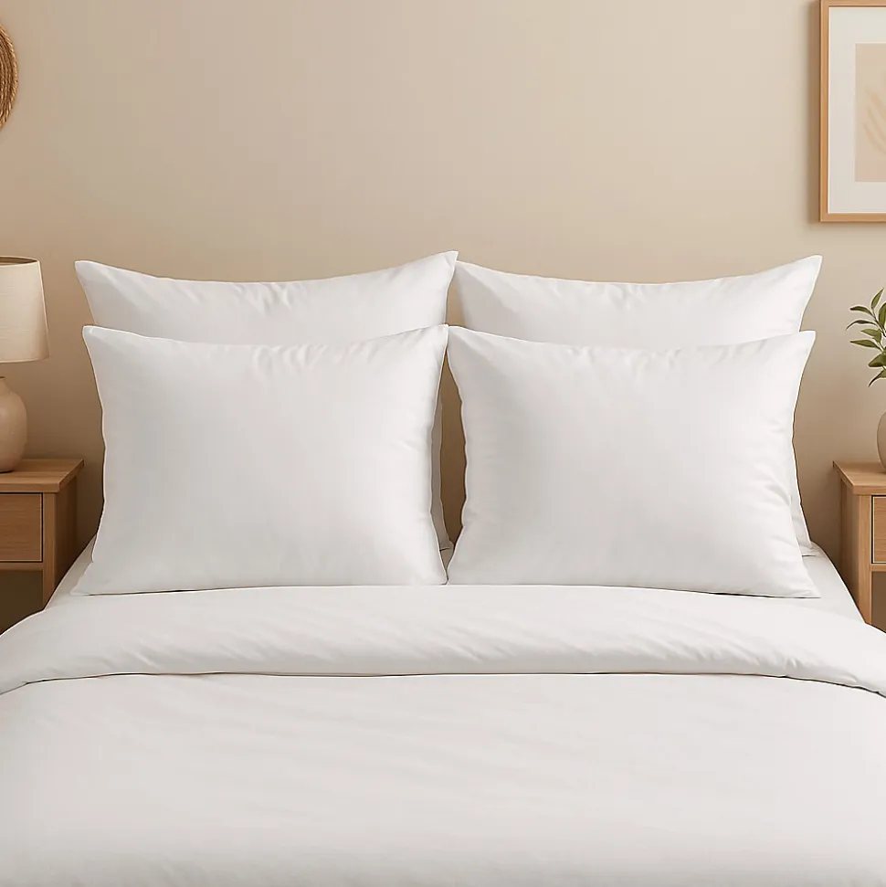 4 Oreillers blancs 60x60Tissu Microfibre traité anti acariensGarnissage : 400 grs par m² de fibre PolyesterLavable à 40°Pas de séchage tambourPas de repassagePas de nettoyage à secFabrication française