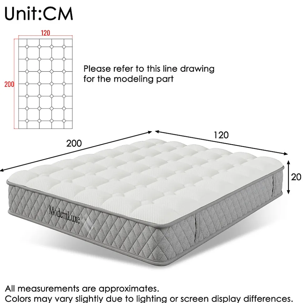 ▶ ▶ Détails ▶────────────────● Taille : 200 x 120 cm (L x l)● Hauteur : 20 cm● Composition du noyau : 7 zones de ressorts ensachés avec mousse froide● Fermeté : H3 (moyenne)● Poids corporel maximal : 140 kg● Nombre de ressorts : 589 ressorts● Zones de couchage : 7 zones● Convient pour les positions de sommeil : Dormeur sur le ventre, sur le côté, sur le dos● Matériaux : Mousse froide, ressorts ensachés, 100 % polyester (revêtement)● Régulation climatique : Respirant et aéré● Particularités : Convient aux personnes allergiques aux poussières, tissu antidérapant avec points PVC● Conseils d’entretien : Ne pas laver à l’eau, nettoyer uniquement avec un chiffon humide● Nombre de pièces : 1● Livraison : Enroulée et sous vide● Poids brut : 22,58 kg● Poids net : 20,48 kg► Remarques ►※ Le matelas arrive sous vide et se développera à sa taille complète après ouverture.
