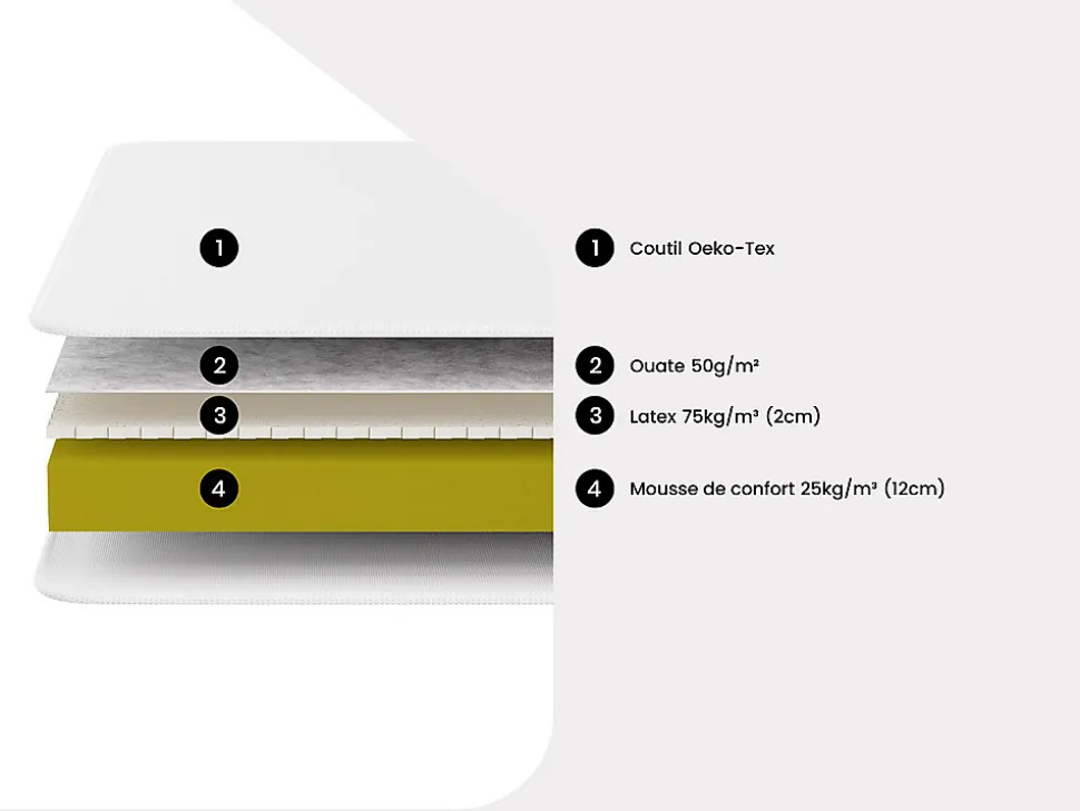 Offrez-vous un sommeil de qualité avec le matelas ELECTRE.Caractéristiques Technologie (âme) : Mousse Soutien : Ferme Densité (âme) : 25 kg/m³ Technologie matelas (accueil) : Latex Densité (accueil) : 75 kg/m³ Accueil : Moelleux Garnissage du matelas : Ouate Densité (garnissage) : 50 g/m2 Coutil (matière) : Polyester Couleur (nuance) : Blanc Matière (précision) : 100 % Polyester Taille (couchage) : 70 x 190 cm Taille : 70×190 cm Nombre de places : 1 place Déhoussable Compressé/roulé : Compressé/roulé : Dessous antidérapantDimensions Longueur : 190 cm Hauteur : 14 cm Profondeur : 70 cm Epaisseur matelas : 14 cm Hauteur de l’âme : 12 cmLivraisonColisColis n°1 : Longueur 74 cm, Largeur 32 cm, Hauteur 32 cm, Poids 9 kg.