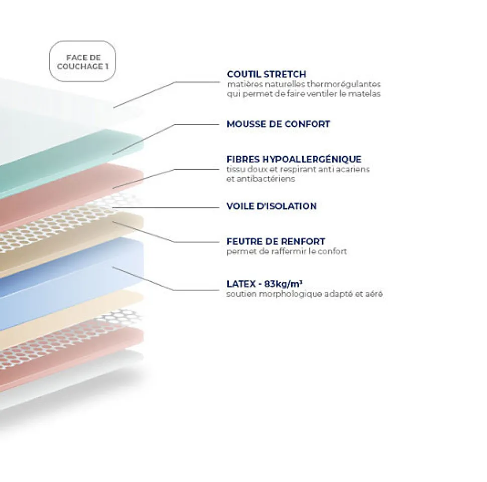 Matelas Morphozone 200 Essenzia – Confort Ferme16 cm de latex haute densité – 83 kg/m³ – dont 20 % de latex naturel – Coutil stretch bambouÀ travers sa gamme Latex Perforé, Essenzia propose des matelas conçus pour offrir un maintien précis, une aération naturelle et un confort ciblé adapté à toutes les morphologies. Le Morphozone 200 s’inscrit dans cette volonté d’excellence : un matelas 100 % latex perforé, d’une densité élevée (83 kg/m³) et enrichi de 20 % de latex naturel, pour un soutien durable et une respirabilité exceptionnelle.Ce modèle se distingue par un noyau de latex de 16 cm, offrant une structure plus généreuse que les modèles Morphozone 180 et 190. Cette épaisseur accrue garantit un maintien encore plus stable, une longévité supérieure et un confort ferme, parfaitement équilibré.Grâce à ses 7 zones différenciées, il suit la morphologie du dormeur avec précision :– épaules assouplies,– soutien renforcé au bassin,– zones tonifiées au niveau des jambes,afin d’offrir un alignement parfait de la colonne vertébrale.Le coutil stretch bambou, naturellement anallergique, respirant et anti-acarien, apporte une douceur exceptionnelle et améliore encore la ventilation du matelas.Confort et structureLe Morphozone 200 repose sur une technologie 100 % latex perforé offrant :un soutien ferme, idéal pour stabiliser la colonne vertébrale ;une aération permanente grâce aux alvéoles verticales du latex ;une indépendance de couchage totale, même pour les dormeurs agités ;une adaptation progressive grâce aux 7 zones de confort morphologiq