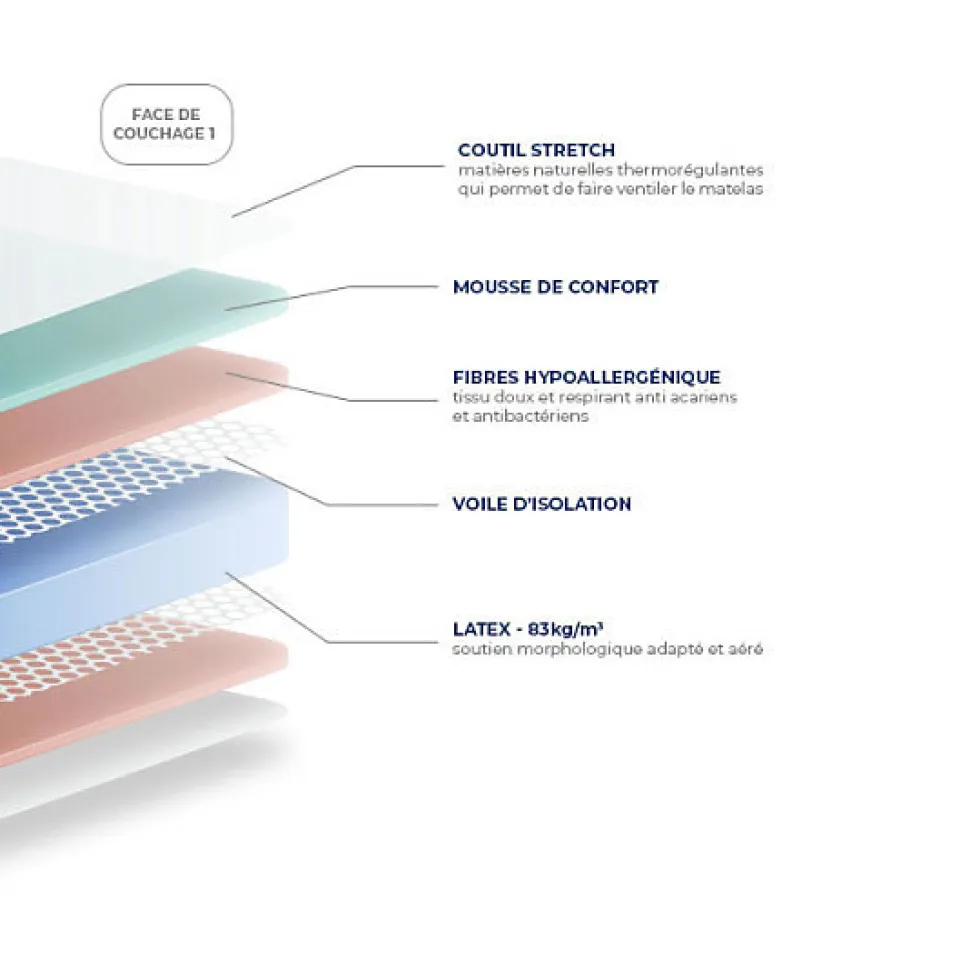 Matelas Morphozone 215 Essenzia – Latex Haute Densité & Confort MoelleuxÀ travers sa collection Latex perforé, Essenzia développe des matelas en latex naturel et en latex perforé haute densité, conçus pour offrir un maintien précis, un soutien constant et une respirabilité exceptionnelle.Le Morphozone 215 s’appuie sur une base technique identique au Morphozone 200 mais propose un accueil moelleux, idéal pour les dormeurs recherchant à la fois tonicité du soutien et douceur de surface.Avec un cœur de 16 cm de latex perforé 83 kg/m³, incluant 20 % de latex naturel, il offre une aération permanente, une excellente indépendance de couchage et une longévité supérieure.Les 7 zones différenciées assurent un alignement optimal de la colonne, un soutien renforcé du bassin et un soulagement des épaules et zones de pression.Le tout est enveloppé dans un coutil stretch bambou, naturellement hypoallergénique, respirant et naturellement anti-acarien — une solution saine, durable et sans traitement chimique ajouté.✦ Confort et structureLe Morphozone 215 repose sur un bloc de latex perforé 16 cm – densité 83 kg/m³, dont 20 % de latex naturel.Cette composition haut de gamme garantit :un accueil moelleux, doux et enveloppant,un soutien ferme et ergonomique,une aération constante grâce aux perforations verticales,une adaptation instantanée à toutes les morphologies,une indépendance de couchage d’excellence.Les 7 zones de confort permettent un soutien ciblé :zones souples aux épaules et aux genoux,renfor