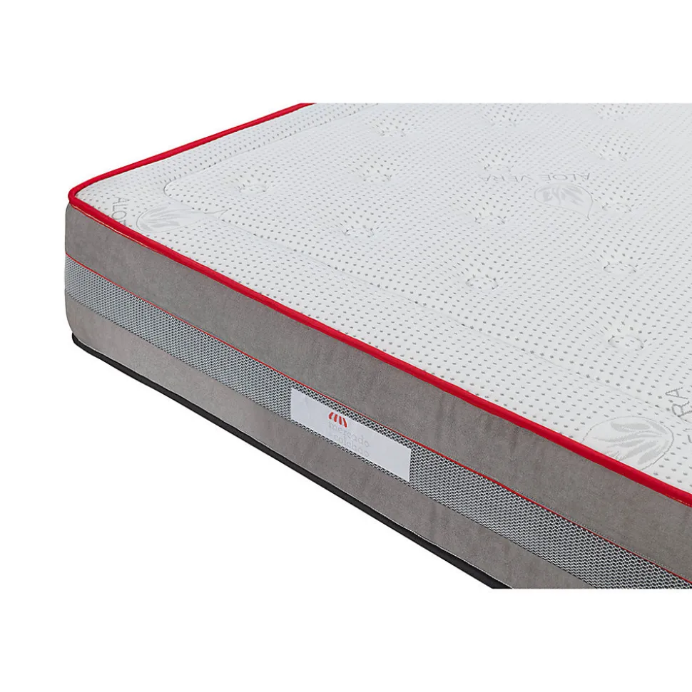 Matelas Luxury : ressorts ensachés et mousse viscoélastique pour soutien adaptatif. Épaisseur 27 cm. Couleurs : gris, blanc, rouge.