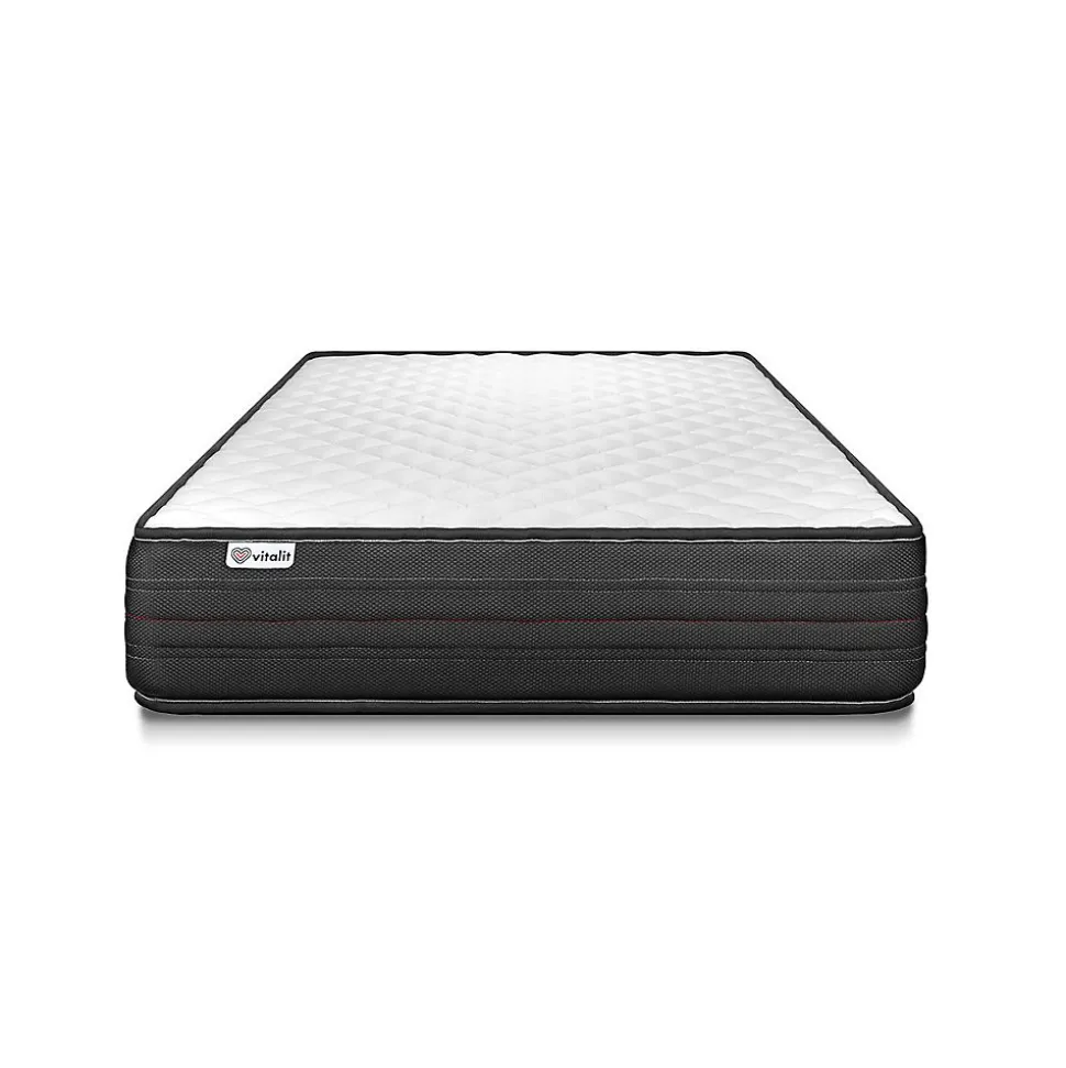 Faites le plein d’énergie positive grâce aux solutions de literie énergisantes Vitalit qui allient confort, maintien et souplesse et permettre à votre corps de prendre le temps de se revitaliser. Les matelas et sommiers Vitalit sont pensés pour s’adapter aux spécificités corporelles et au sommeil de chacun. De fabrication portugaise, les produits Vitalit sont rigoureusement élaborés selon des cahiers des charges précis. Jusqu’à la livraison, notre objectif : votre satisfaction.Le matelas VITALPOWER bénéficie de la combinaison de 2 technologies de mousses : la mousse polyuréthane Haute Densité assurant un soutien ferme et la mousse à mémoire de forme pour un accueil enveloppant. D’une épaisseur de 20 cm, il s’adapte parfaitement à votre morphologie et sera votre compagnon idéal pour des nuits réparatrices. Son coutil micro perforé garantie une aération optimisée.Epaisseur 20 cmÂme 100% mousse polyuréthane Haute Densité 15cmMousse polyuréthane à mémoire de forme D 55 kg + Mousse polyuréthane Soft HD Fibres 100% Polyester 350G/M2Coutil micro perforé ultra respirable 100% PolyesterPlate-Bande 3D micro-aérée 100% Polyester pour optimiser l’aération du matelasConfort : Ferme – Accueil enveloppant – Soutien ferme3 zones de confort Epaisseur 20 cmÂme 100% mousse polyuréthane Haute Densité 15cmMousse polyuréthane à mémoire de forme D 55 kg + Mousse polyuréthane Soft HD Fibres 100% Polyester 350G/M2Coutil micro perforé ultra respirable 100% PolyesterPlate-Bande 3D micro-aérée 100% Polyester pour optimiser l’aération du matelasConfort : Ferme – Accueil enveloppant – Soutien ferme3 zones de confort