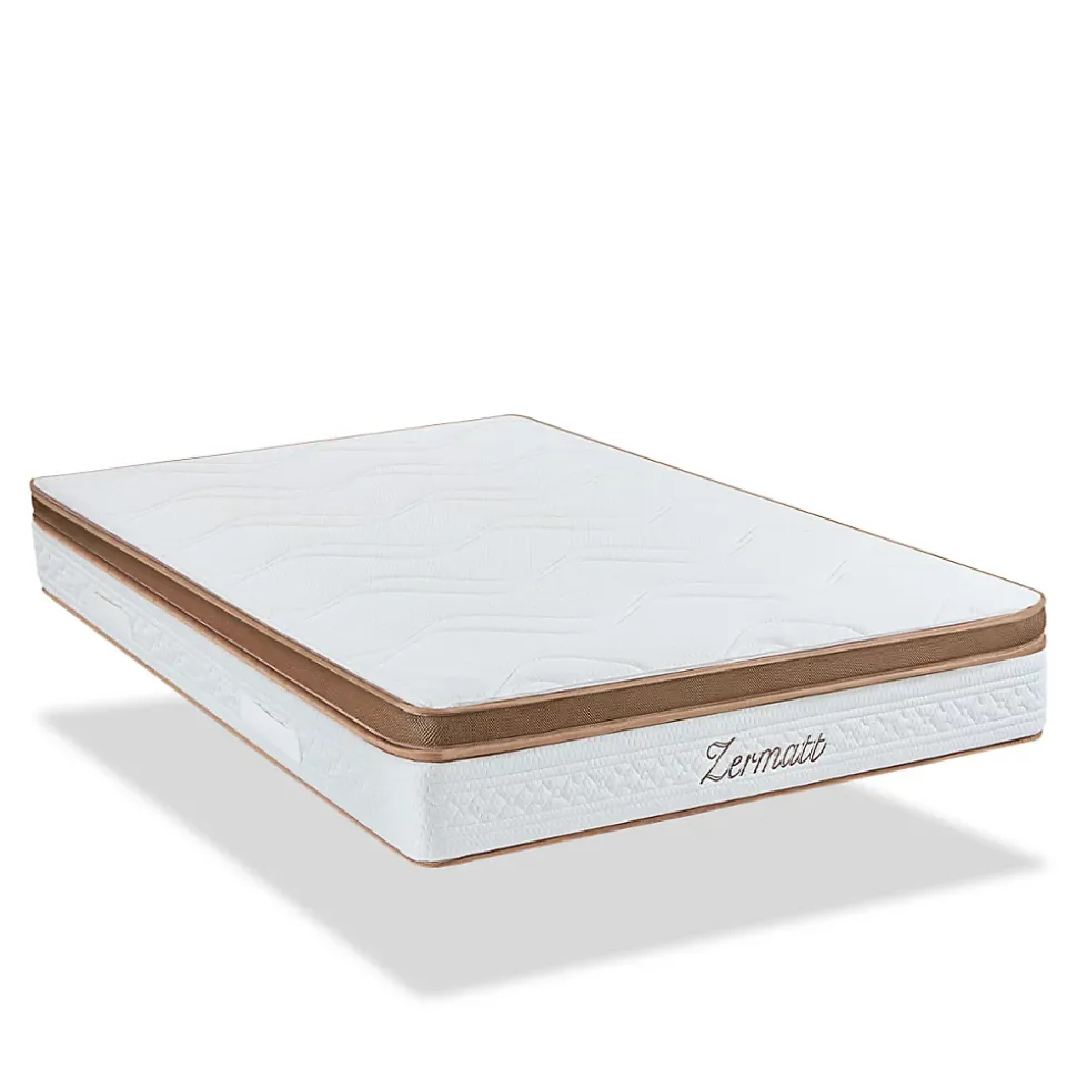 CARACTERISTIQUES :Dimensions disponibles (cm) : 90×190 – 90×200 – 140×190 – 140×200 – 160×200 – 180×200 – 200x200Epaisseur : 31 cmTechnologie : Mémoire de forme Accueil : EnveloppantSoutien : FermeIndépendance de couchage : ExcellenteAération : ExcellenteFabrication : FrançaiseDéhoussable : Topper Oui – Matelas NonConditionnement : A platGarantie : 10 ansCOMPOSITION :Âme intérieure du matelas (CertiPUR) : 20 cm de mousse Haute Résilience 43 kg/m³ (matelas) + 8 cm de mousse viscoélastique à mémoire de forme 60 kg/m³ (topper)Coutil supérieur (Oeko-Tex): Tissu 3D + 4 poignées (matelas) – Face Hiver en tissu stretch polyester et cachemire / Face Eté en tissu 3D et plate-bande d’aération 3D (topper)POINTS FORTS :Ergonomie : La mousse viscoélastique à mémoire de forme du topper s’adapte à chaque morphologie, permettant une meilleure circulation sanguine ainsi qu’une réduction des douleurs dorsales et articulaires.Indépendance de couchage : La mousse viscoélastique à mémoire de forme évite toute transmission de mouvement, vous garantissant un sommeil plus paisible.Fermeté équilibrée : Accueil enveloppant en surface et soutien ferme en profondeur.Faces climatiques : Le topper possède une face été en tissu 3D (aération de la surface de couchage) et une face hiver en cachemire (fibre isotherme qui conserve la chaleur), assurant un confort toute l’année.Hygiène : Le matelas dispose d’une excellente aération, gage d’une meilleure hygiène et durée de vie de votre literie.