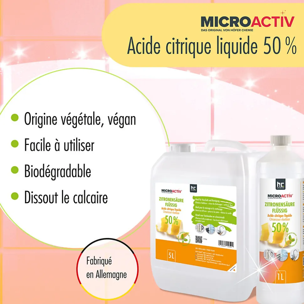Acide citrique liquide 50% – qualité techniqueL’acide citrique liquide n’est pas seulement , hautement énergétique et bon marché, mais aussi très efficace. Dimensions du bidon : H25 cm x L 19,5 cm x l 14,5 cm.Ainsi, il est surtout utilisé comme détartrant pour les bouilloires, les thermoplongeurs ou les machines à café. Mais aussi pour les robinets, les pommeaux de douche ou les têtes en acier inoxydable. En utilisant de l’acide citrique plutôt que des cartouches de détartrage onéreuses, par exemple pour les machines à expresso de marque, on peut économiser beaucoup d’argent. Le résultat est identique. Contrairement au vinaigre, l’acide citrique préserve également les joints.Tous les avantages de l’acide citrique en un coup d’œilTrès énergétiqueBon marchéUtilisable de manière polyvalenteL’expérience montre que les dosages suivants ont fait leurs preuves pour le détartrage : (pour 500 ml d’eau froide)Bouilloires, cuiseurs à œufs, casseroles et poêles : verser env. 45 ml dans de l’eau froide et remplir jusqu’au bord du calcaire.Machines à café : verser env. 45-90 ml dans de l’eau froide et remplir le réservoir d’eau de la machine, faire fonctionner la machine une fois et la faire fonctionner à nouveau avec de l’eau claire.Cafetières & gobelets pour le brossage des dents : verser env. 45-90 ml dans de l’eau froide et remplir jusqu’au bord du calcaire.Lave-vaisselle : verser env. 135-180 ml dans le lave-vaisselle et faire tourner à env. 50 °C sans vaisselle.