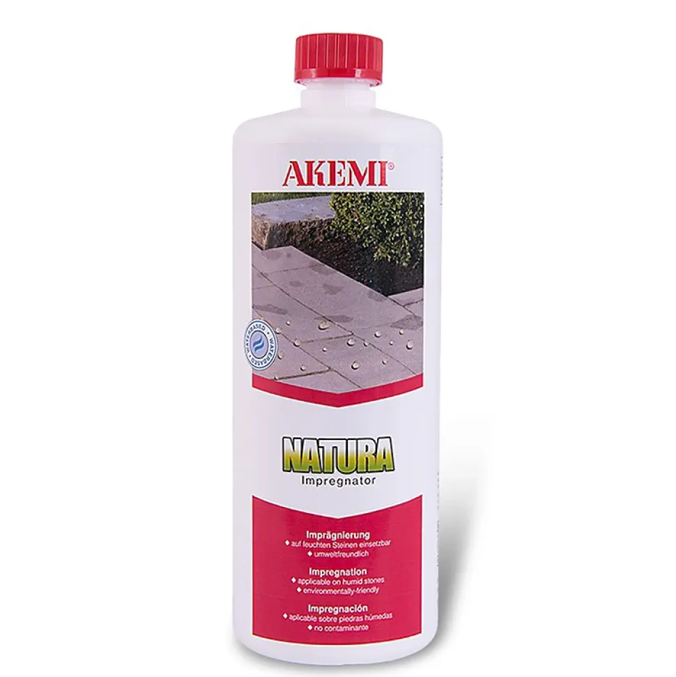 Natura Impregnator – AkemiNatura Impregnator protège les pierres naturelles et artificielles absorbantes, la terre cuite, le terrazzo et les plaques de céramique non vernies, contre la pénétration de l’eau et les saletés.Particulièrement approprié pour des surfaces encore humides, surtout à l’extérieur et pour l’application dans les chaînes de polissage de l’industrie.Caractéristiques : Sans solvants, pas de COVApplication possible sur les surfaces encore humidesValeur pH neutre, bien approprié pour des surfaces poliesRéduction d’absorption d’eau et de saleté sous action de l’humiditéElimination rapide de l’humidité pendant un période sèche par libre diffusion de vapeurConservation de la capacité de respirer de la pierre, pas de film en surfaceStabilité vis-à-vis des UVBonne stabilité alcaline envers mortier de jointoyage minéralEn règle général, la couleur de la pierre n’est pas modifiée (faire un essai au préalable)Rendement : env. 15m²/litre suivant le pouvoir absorbant de la pierre.Utilisation :Bien agiter avant usage. Les conditions optimales pour l’imprégnation sont: une pierre la plus sèche possible, une température comprise entre 15 et 25°C ainsi qu’une protection contre la pluie de 24 heures. Pendant le traitement, le revêtement ne doit pas être chauffé par les rayons du soleil ni par un chauffage au sol. Les fissures de plus de 0,3 mm doivent être fermées avant le traitement anti-tache. En général, 1 à 2 applications sont suffisantes. Secouer avant utilisation. Appliquer le produit avec un pinceau ou un balai mouiller. Sur des façades, on peut utiliser un pulvérisateur
