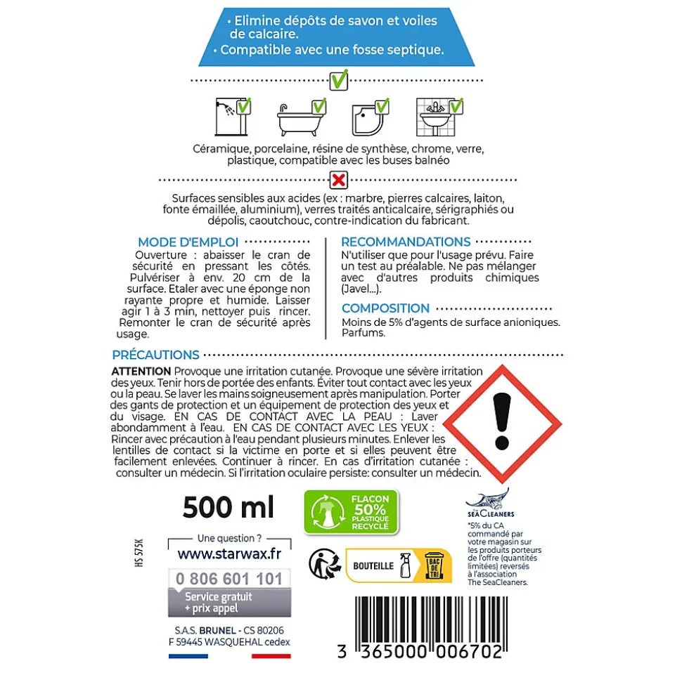 Élimine salissures, dépôts de savon et voiles de calcaire pour un support lisse et brillant.