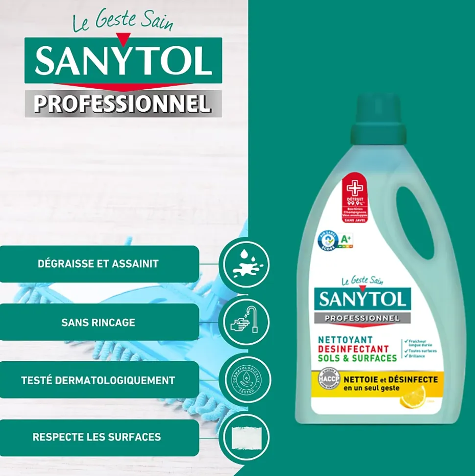 Sanytol – Nettoyant désinfectant sols et surfaces citron (5 L) Assurez une hygiène parfaite dans toute la maison avec ce nettoyant Sanytol. Sa formule sans javel élimine 99,9 % des bactéries, virus et champignons, tout en respectant les surfaces lavables. Idéal pour les sols, plans de travail, poignées de porte, sanitaires et autres surfaces fréquemment touchées. Son parfum citron laisse une sensation de fraîcheur durable. Prêt à l’emploi, il suffit de verser une petite quantité sur un chiffon ou une serpillière, puis de nettoyer la surface souhaitée. Contenance : 5 L. Produit dangereux – respecter les précautions d’emploi.
