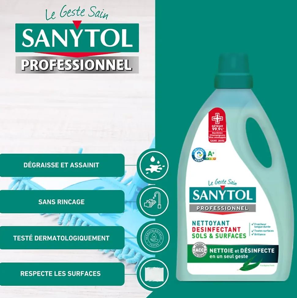 Sanytol – Nettoyant désinfectant sols et surfaces eucalyptus (5 L) Assurez une hygiène parfaite dans toute la maison avec ce nettoyant Sanytol. Sa formule sans javel élimine 99,9 % des bactéries, virus et champignons, tout en respectant les surfaces lavables. Idéal pour les sols, plans de travail, poignées de porte, sanitaires et autres surfaces fréquemment touchées. Son parfum eucalyptus laisse une sensation de fraîcheur durable. Prêt à l’emploi, il suffit de verser une petite quantité sur un chiffon ou une serpillière, puis de nettoyer la surface souhaitée. Contenance : 5 L. Produit dangereux – respecter les précautions d’emploi.