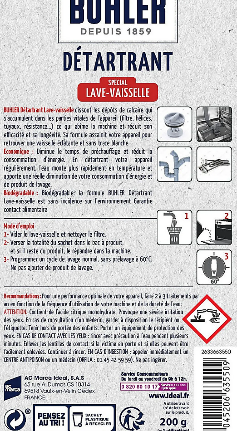 Buhler – Nettoyant détartrant lave-vaisselle (200 g) Assurez une hygiène parfaite de votre lave-vaisselle avec ce nettoyant Buhler. Sa formule à base d’acide citrique dissout efficacement les dépôts de calcaire et élimine les résidus incrustés dans les parties vitales de l’appareil. Idéal pour maintenir l’efficacité de lavage, éliminer les traces blanches et prolonger la durée de vie de votre appareil. Mode d’emploi : vider le lave-vaisselle et nettoyer le filtre, verser la totalité du sachet dans le bac à produit, programmer un cycle de lavage normal à 60 °C sans prélavage, sans ajouter de produit de lavage. Contenance : 200 g. Produit dangereux – respecter les précautions d’emploi
