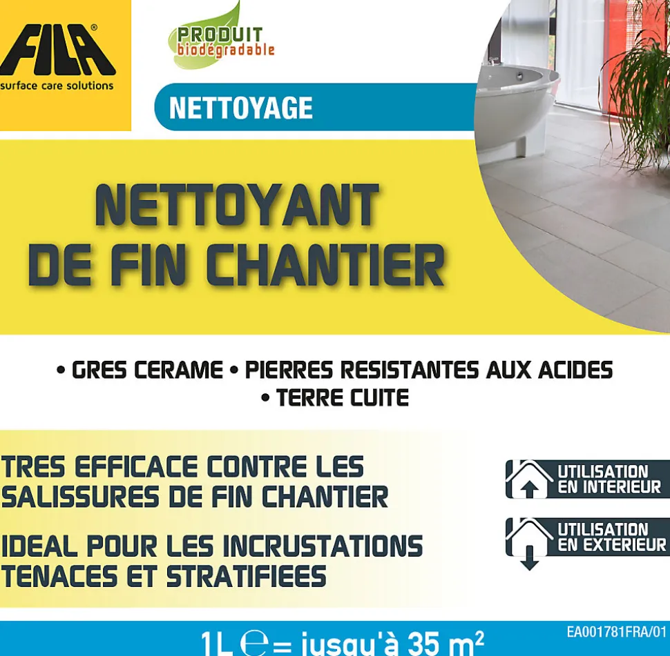 - NETTOYANT DE FIN CHANTIER 1L élimine les résidus et les salissures de chantier, le calcaire et la rouille.
