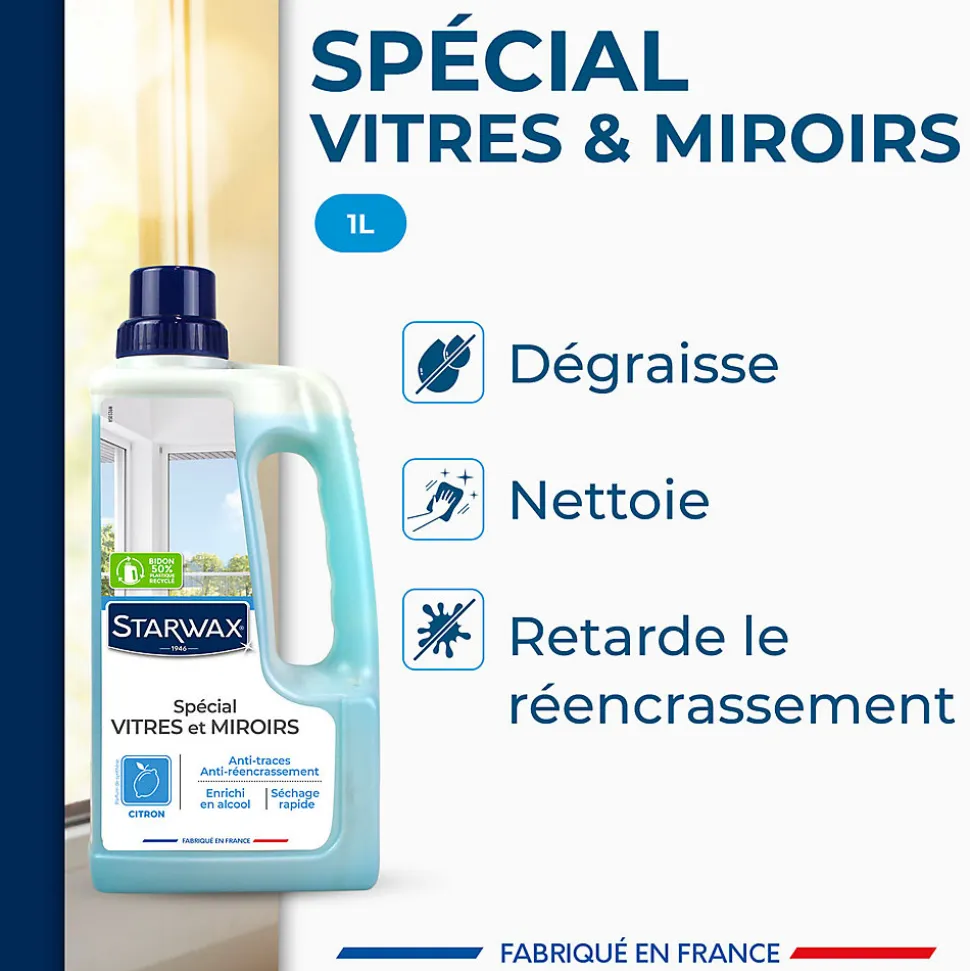 La forte concentration en alcool qui permet un dégraissage rapide.Son parfum frais et agréable.Le format qui permet de recharger un pulvérisateur. Le produit permet de dégraisser et de nettoyer vos vitres sans laisser de trace. Sa texture permet d’adhérer à la vitre pour enlever les saletés. Sa formule retarde la formation de buée, minimise le dépôt de poussière et les traces d’eau après la pluie