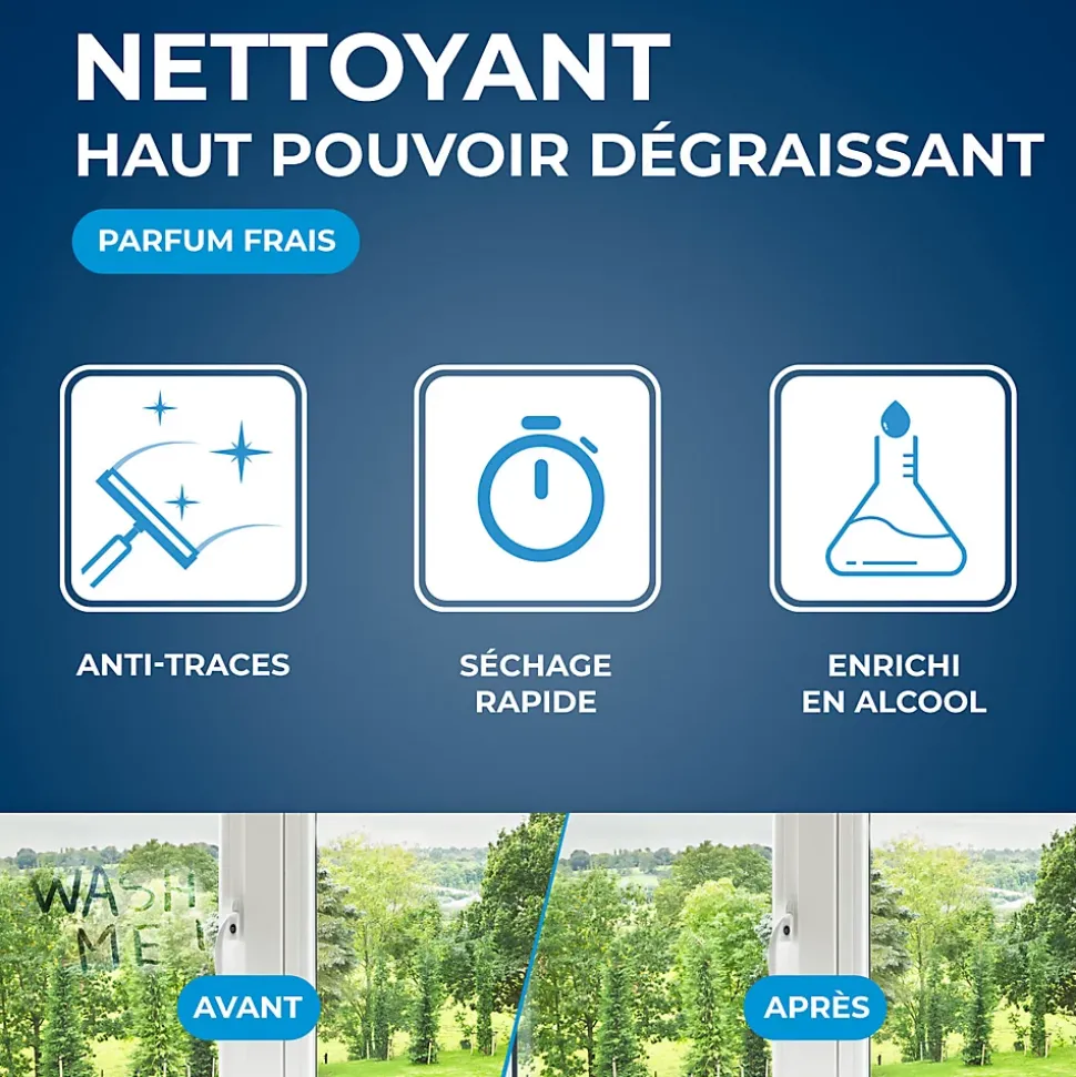 Forte concentration en alcool qui permet un dégraissage rapide.Parfum frais et agréable.Format qui permet de recharger un pulvérisateur. Le produit permet de dégraisser et de nettoyer vos vitres sans laisser de trace. Sa texture permet d’adhérer à la vitre pour enlever les saletés. Sa formule retarde la formation de buée, minimise le dépôt de poussière et les traces d’eau après la pluie