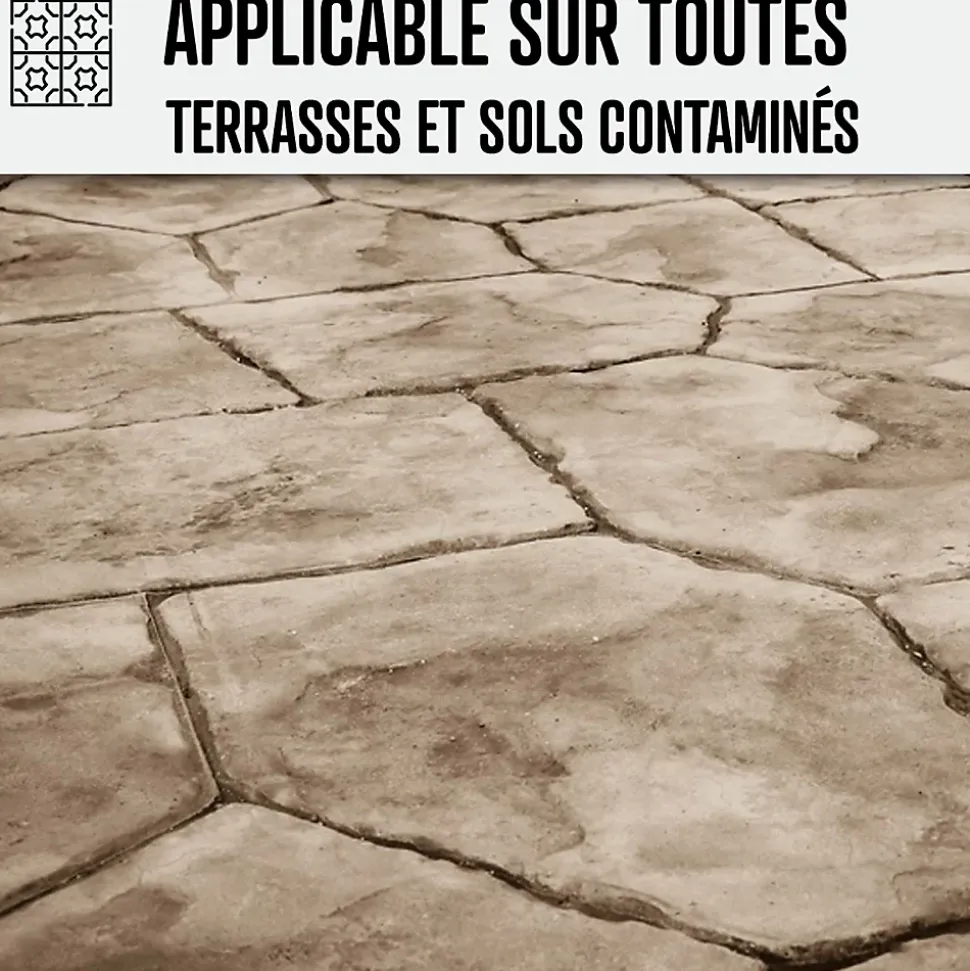 Nettoyant spécial pour sol de terrasse à action ultra rapide. Action curative et immédiate sur les algues et lichens. Nettoie, désincruste et décontamine. Application par pulvérisation. Pour les terrasses en pierre, béton, tomette, carrelage, travertin, terre cuite.CONSOMMATION1 L traitera :4 à 6 m² de surface si le produit est utilisé pur pour un support très encrassé.8 à 12 m² de surface si le produit est utilisé à 50% de dilution pour un support moyennement encrassé.16 à 24 m² de surface si le produit est utilisé à 25% de dilution pour un support peu encrassé.Application : En tant que fabricant Français, nous mettons à disposition un document PDF disponible en bas de page vous indiquant les informations produits ainsi que les consignes d’application.La plateforme ne permet pas encore le regroupement des différents modèles. Pour voir toutes les contenances et toutes les couleurs, tapez ou copier-coller les termes suivants dans la barre de recherche : Nettoyant terrasse professionnel rapide pavé autobloquant pierre béton