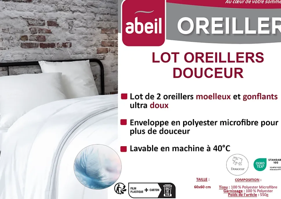 Confort et douceur. Oreiller rectangulaire, au confort ferme (650g) et tout doux grâce à son enveloppe en polyester microfibre. Lavable en machine à 40°C. Retrouvez-le également en version moelleux !