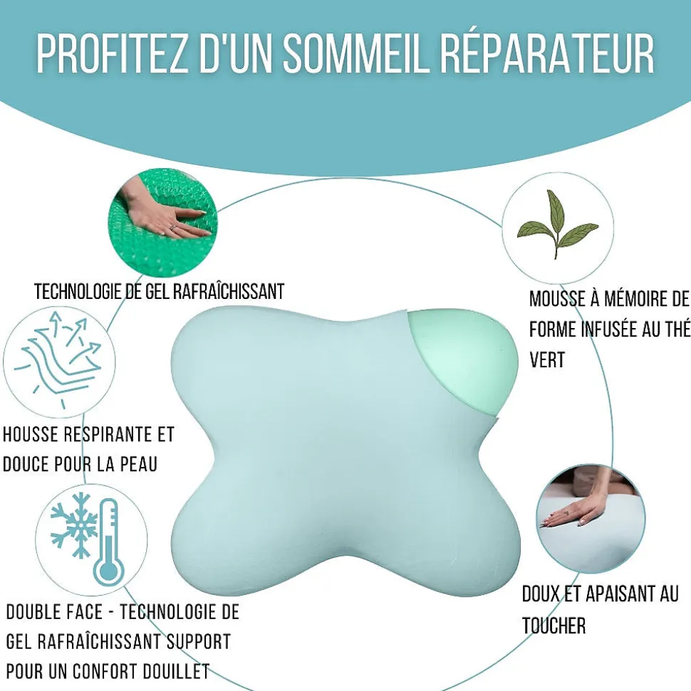 Dormez paisiblement avec cet oreiller papillon qui allie confort et ergonomie pour un sommeil réparateur. Sa conception unique facilite le changement de position et offre un excellent soutien cervical. Grâce à son infusion de thé vert, il procure une sensation apaisante et rafraîchissante. Son revêtement respirant et son gel thermorégulateur assurent une température idéale toute la nuit.