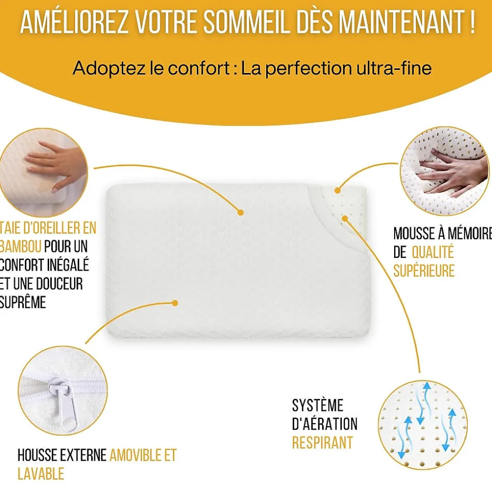 Profitez d’un confort exceptionnel avec cet oreiller conçu pour s’adapter aux besoins des dormeurs sur le ventre et sur le dos. Sa mousse à mémoire de forme permet un maintien idéal sans créer de tension, tandis que son tissu en bambou apporte une sensation de douceur et de fraîcheur. Son design ergonomique favorise une posture détendue et aide à réduire les douleurs cervicales. Facile d’entretien, il est doté d’une housse lavable qui préserve sa qualité dans le temps.