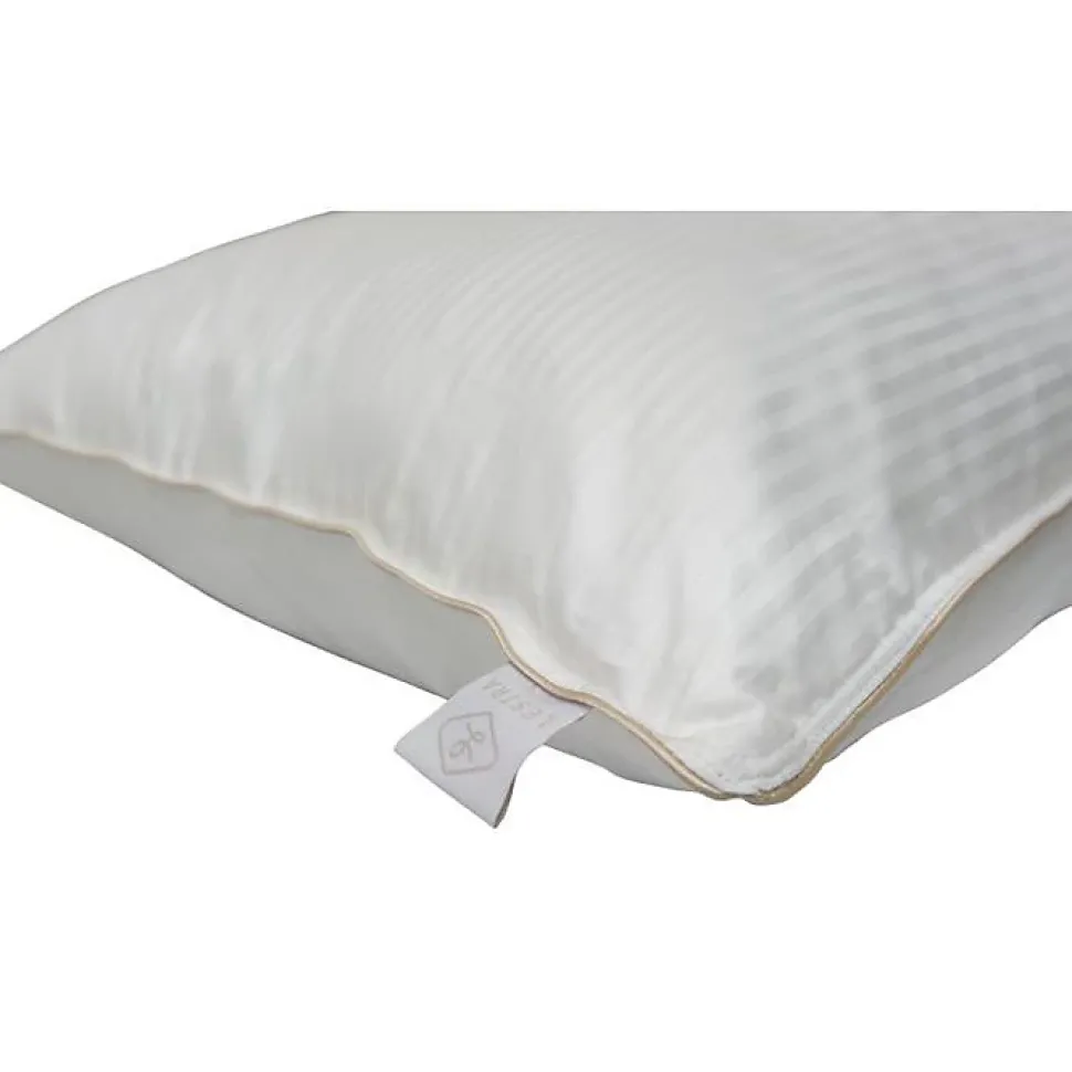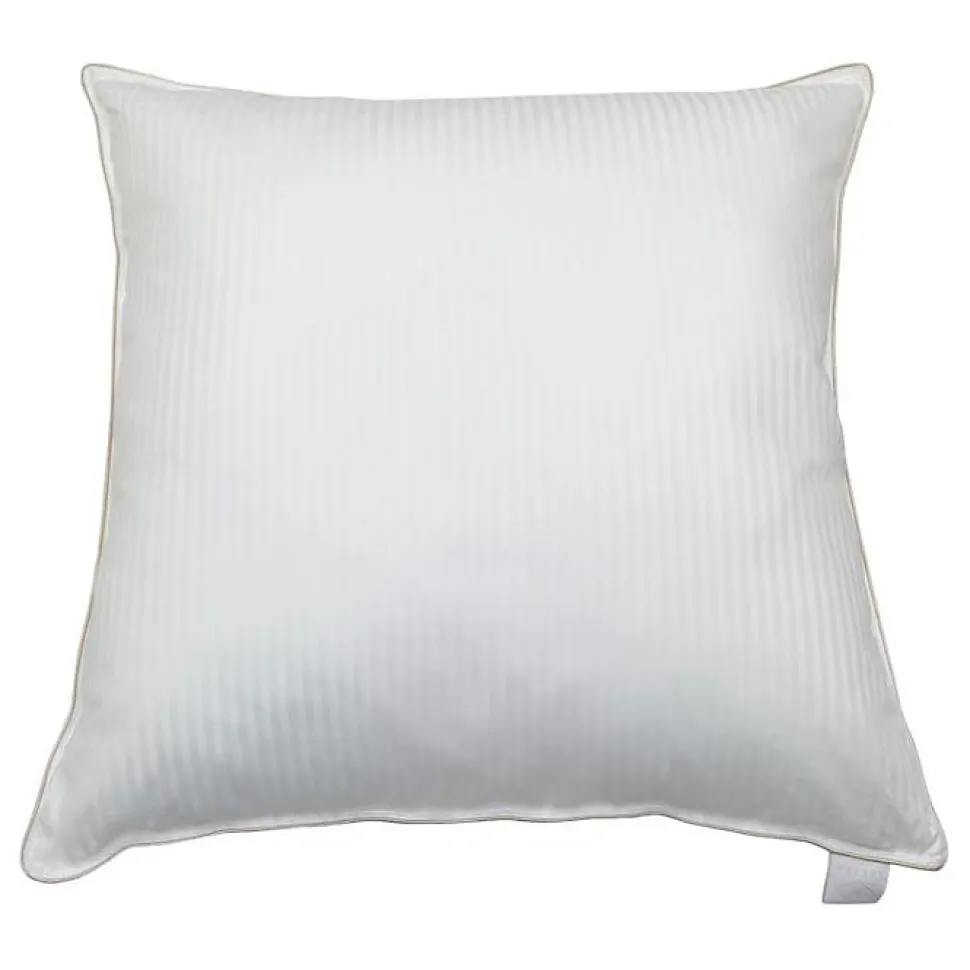 Oreiller Fjord Grand Hotel Moelleux Com’Duv satin de coton rayé Lestra. Garnissage COM’DUV 100% polyester siliconé, enveloppe 100% coton satin rayé, finition passepoil champagne. Disponible en 65 x 65 cm (800 g) et 50 x 70 cm (600 g). Certifié OEKO-TEX. Fabriqué en France. Livré sous valise intissée beige avec leaflet.