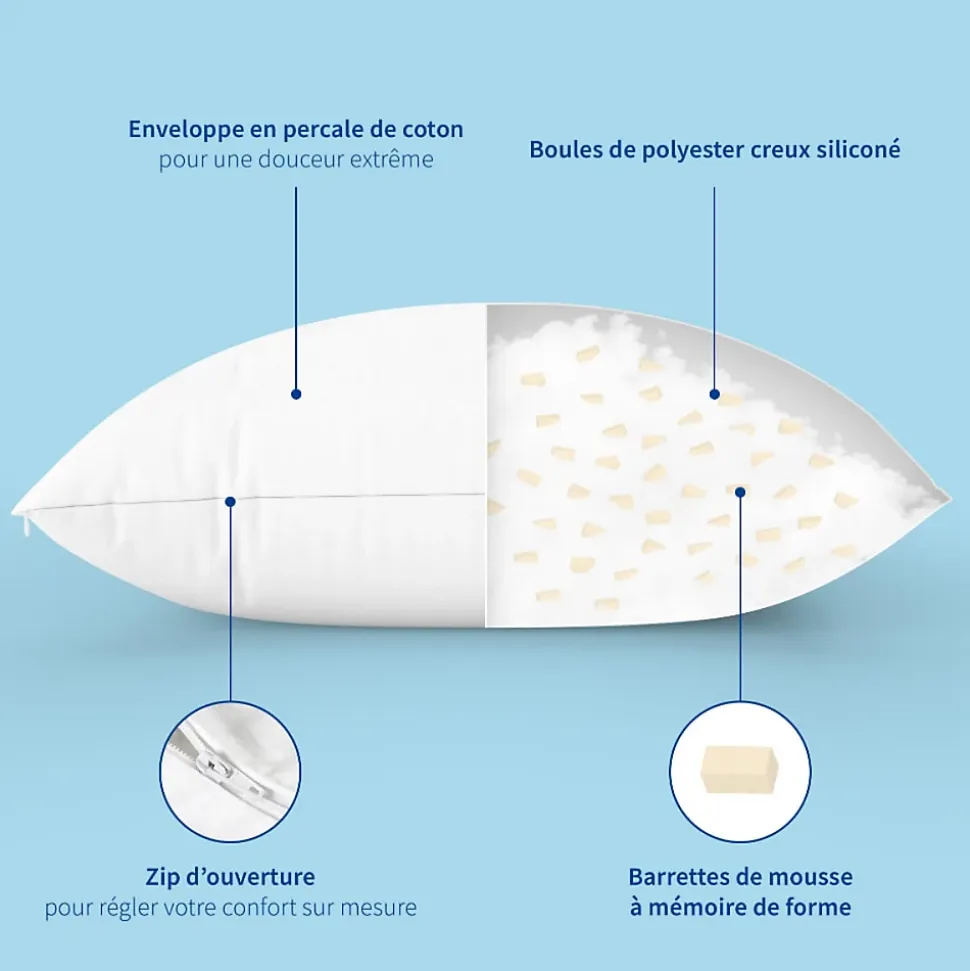 L’Oreiller Memoire de forme Mixte Anti-acariens – Enveloppe : 100% coton qualité percale- Confort Ergonomique- Traitement Anti-acariens- Fabrication française- Lavable en machine (40°)Tous les bienfaits d’une bonne nuit de sommeilL’oreiller Memoire de forme Mixte Anti-acariens bénéficie d’une technologie exclusive. Son garnissage se compose d’un mélange de mousse viscoélastique et de boules de fibres creuses siliconées indéformables. Cet alliage fluide épouse parfaitement les courbes de la nuque et de la tête, en soulageant les points d’appui. Il vous assure un soutien parfait, tout en reprenant sa forme initiale au petit matin.La protection et le confort ergonomiqueCet oreiller combine la technologie, le savoir-faire et une protection optimale, pour vous offrir un maximum de confort. Fabriqué en France, il se distingue par le soin apporté à la qualité des finitions. Son enveloppe 100% coton est pourvue d’une ouverture zippée permettant de retirer de la matière et moduler l’épaisseur de l’oreiller selon vos goûts. Elle bénefice d’un traitement naturel à base d’huiles essentielles Ce traitement antiacarien vous protège aussi des bactéries et empêche le développement des moisissures. Il résiste parfaitement aux lavages. Le coton qualité percale lui confère une douceur exceptionnelle et une aération optimale. Facile à entretenir, cet oreiller se lave en machine à 40°.Ce produit bénéficie d’un traitement biocide. Principe actif extrait géraniolProduit comportant au moins 70% de matières recycléesProduit totalement recyclable