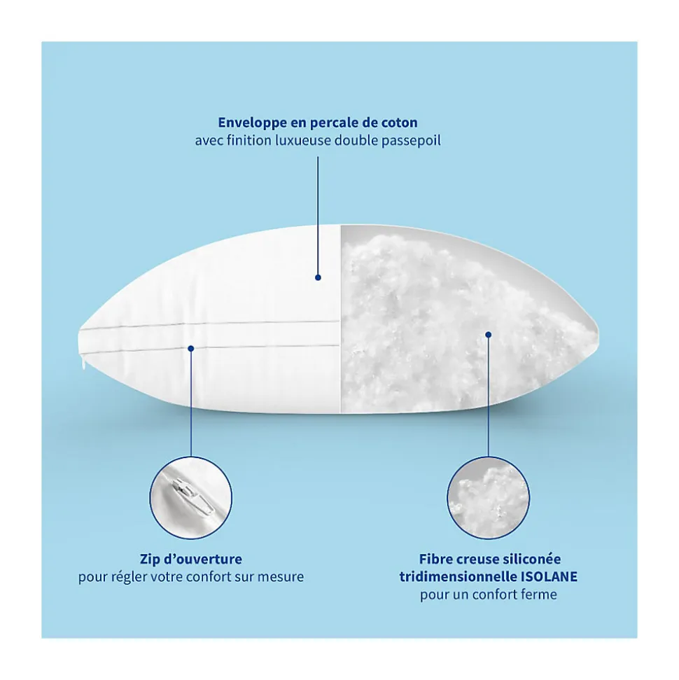 L’oreiller SENSATION DUVET de BLEU CÂLIN- Confort Souple- Enveloppe 100% coton percale- Fabrication française- Lavage en machine (40°)Un parfait équilibre entre confort et pratiqueL’oreiller SENSATION DUVET de BLEU CÂLIN bénéficie d’une technologie exclusive : le garnissage ISOLANE MICRO. Cette microfibre siliconée assure un circulation de l’air optimale et un soutien tout en douceur. Cette technologie de pointe lui confère un confort comparable à celui d’un modèle au garnissage en pur duvet. La qualité BLEU CÂLINL’enveloppe 100% coton qualité percale du SENSATION DUVET procure une douceur remarquable au toucher. Elle affiche une finition passepoil à double couture. Cet oreiller combine qualité et pratique. Facile à entretenir, il vous garantit une hygiène parfaite. Pour le nettoyer, il vous suffit de le laver en machine. Son garnissage innovant vous assure un séchage facile!Ce produit est certifié de la norme OEKO-TEX Standard 100 – Testé pour les substances nocives.Produit comportant au moins 70% de matières recycléesProduit totalement recyclable