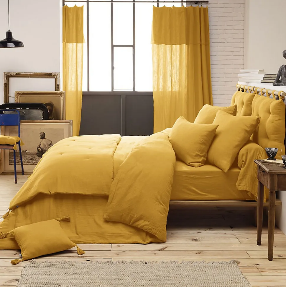 Chemin de Lit 90x200cm Capitonné Gaze de Coton Safran Ourea.Un indémodable pour prévenir le froid et habiller élégamment votre lit… mais aussi vos banquettes et canapés ! Une conception en double gaze de coton, légère, fluide et confortable. Une matière qui gagne en souplesse et en douceur au fil des lavages. ment froissée : pas besoin de repasser !Fabrication 100% Coton, densité 125g/m2. Garnissage 100% Polyester, densité 300 g/m2. Capitonnage léger. Finition avec pompon aux 4 coins. Produit certifié OEKO-TEX.Dimensions : 90x200cm.Entretien facile : Lavage à 30°C avec couleurs similaires. Pas de sèche-linge.Salon, Art de la table, Chambre : la gamme de linge de maison Ourea a des solutions pour tout !