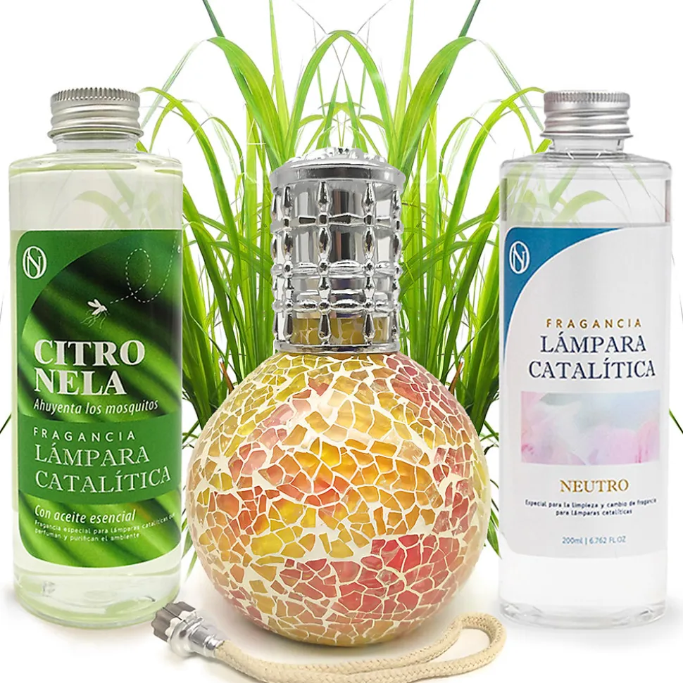 ❗ Pack économique Lampe Catalytique Mosaïque Bicolore + Parfum Citronnelle 200 ml + Nettoyant Neutre 200 ml + Mèche de Rechange ❗Une lampe catalytique parfume et purifie l’air et élimine les odeurs tenaces telles que celles du tabac, de la cuisine, de l’humidité, des animaux domestiques, etc. Le système de désodorisant à lampe catalytique crée non seulement un environnement parfumé, mais améliore également la qualité de l’air et embellit la pièce d’un design élégant. En seulement 20 à 30 minutes d’utilisation, la pièce sera parfumée pendant 2 heures. Lorsqu’elle est allumée, la pierre chauffe et génère une catalyse, qui décompose les particules odorantes et purifie l’environnement.⁉️ Comment utiliser une lampe catalytique ?1. REMPLIR LA LAMPE DE PARFUM : Retirez le bouchon décoratif et le capuchon et remplissez la lampe aux 3/4 avec le parfum choisi.2. PLACER LA MÈCHE DANS LA LAMPE : Insérez la mèche éteinte dans la lampe et laissez-la imprégner de parfum pendant environ 15 minutes.3. ALLUMER LA MÈCHE : À l’aide d’un briquet ou d’allumettes, allumez la mèche et laissez la flamme allumée pendant 2 minutes, jusqu’à ce qu’elle se réduise.4. ÉTEINDRE LE BRÛLEUR EN SOUFFLANT : Une fois la flamme réduite, soufflez pour l’éteindre complètement et remettez le capuchon décoratif.5. FIXER LA TÊTE DÉCORATIVE : Une fois la flamme éteinte, placez la tête décorative (avec les trous) sur la lampe à catalyse pour diffuser le parfum. Il est recommandé de l’utiliser pendant 20 à 30 minutes.6. ÉTEINDRE LA LAMPE CATALYTIQUE : Pour éteindre complètement la lampe catalytique, retirez le capuchon décoratif et remettez le capuchon métallique fermé, ce qui arrête la combustion.