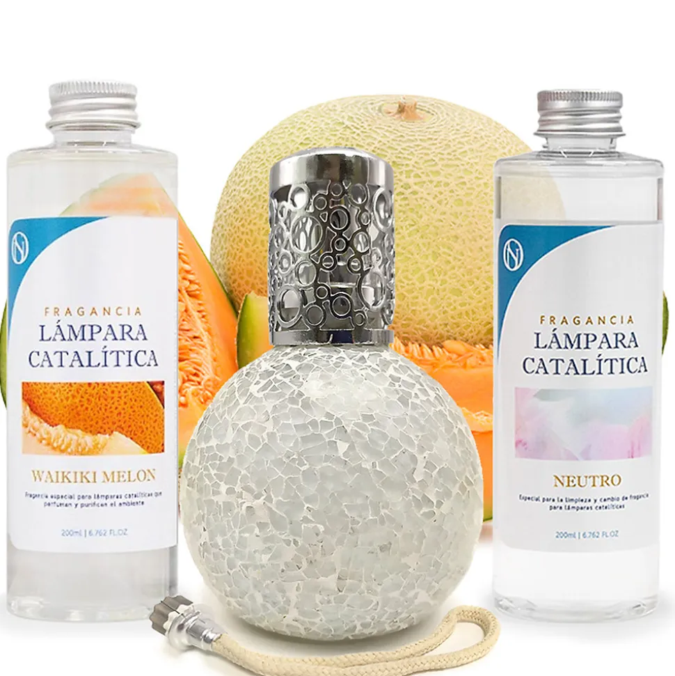 ❗ Pack économique Lampe Catalytique Mosaïque Blanc + Parfum Waikiki Melon 500 ml + Nettoyant Neutre 200 ml + Mèche de Rechange ❗Une lampe catalytique parfume et purifie l’air et élimine les odeurs tenaces telles que celles du tabac, de la cuisine, de l’humidité, des animaux domestiques, etc. Le système de désodorisant à lampe catalytique crée non seulement un environnement parfumé, mais améliore également la qualité de l’air et embellit la pièce d’un design élégant. En seulement 20 à 30 minutes d’utilisation, la pièce sera parfumée pendant 2 heures. Lorsqu’elle est allumée, la pierre chauffe et génère une catalyse, qui décompose les particules odorantes et purifie l’environnement.⁉️ Comment utiliser une lampe catalytique ?1. REMPLIR LA LAMPE DE PARFUM : Retirez le bouchon décoratif et le capuchon et remplissez la lampe aux 3/4 avec le parfum choisi.2. PLACER LA MÈCHE DANS LA LAMPE : Insérez la mèche éteinte dans la lampe et laissez-la imprégner de parfum pendant environ 15 minutes.3. ALLUMER LA MÈCHE : À l’aide d’un briquet ou d’allumettes, allumez la mèche et laissez la flamme allumée pendant 2 minutes, jusqu’à ce qu’elle se réduise.4. ÉTEINDRE LE BRÛLEUR EN SOUFFLANT : Une fois la flamme réduite, soufflez pour l’éteindre complètement et remettez le capuchon décoratif.5. FIXER LA TÊTE DÉCORATIVE : Une fois la flamme éteinte, placez la tête décorative (avec les trous) sur la lampe à catalyse pour diffuser le parfum. Il est recommandé de l’utiliser pendant 20 à 30 minutes.6. ÉTEINDRE LA LAMPE CATALYTIQUE : Pour éteindre complètement la lampe catalytique, retirez le capuchon décoratif et remettez le capuchon métallique fermé, ce qui arrête la combustion.