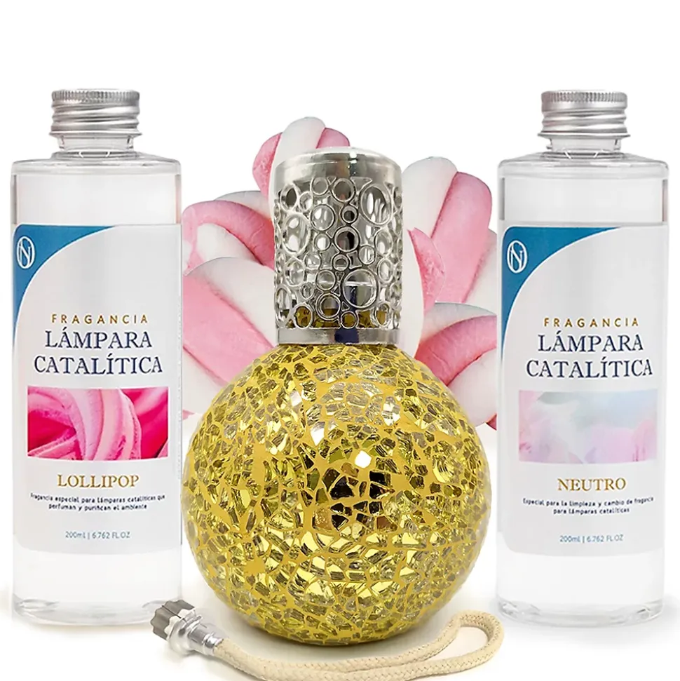 ❗ Pack économique Lampe Catalytique Mosaïque Doré + Parfum Lollipop 200 ml + Nettoyant Neutre 200 ml + Mèche de Rechange ❗Une lampe catalytique parfume et purifie l’air et élimine les odeurs tenaces telles que celles du tabac, de la cuisine, de l’humidité, des animaux domestiques, etc. Le système de désodorisant à lampe catalytique crée non seulement un environnement parfumé, mais améliore également la qualité de l’air et embellit la pièce d’un design élégant. En seulement 20 à 30 minutes d’utilisation, la pièce sera parfumée pendant 2 heures. Lorsqu’elle est allumée, la pierre chauffe et génère une catalyse, qui décompose les particules odorantes et purifie l’environnement.⁉️ Comment utiliser une lampe catalytique ?1. REMPLIR LA LAMPE DE PARFUM : Retirez le bouchon décoratif et le capuchon et remplissez la lampe aux 3/4 avec le parfum choisi.2. PLACER LA MÈCHE DANS LA LAMPE : Insérez la mèche éteinte dans la lampe et laissez-la imprégner de parfum pendant environ 15 minutes.3. ALLUMER LA MÈCHE : À l’aide d’un briquet ou d’allumettes, allumez la mèche et laissez la flamme allumée pendant 2 minutes, jusqu’à ce qu’elle se réduise.4. ÉTEINDRE LE BRÛLEUR EN SOUFFLANT : Une fois la flamme réduite, soufflez pour l’éteindre complètement et remettez le capuchon décoratif.5. FIXER LA TÊTE DÉCORATIVE : Une fois la flamme éteinte, placez la tête décorative (avec les trous) sur la lampe à catalyse pour diffuser le parfum. Il est recommandé de l’utiliser pendant 20 à 30 minutes.6. ÉTEINDRE LA LAMPE CATALYTIQUE : Pour éteindre complètement la lampe catalytique, retirez le capuchon décoratif et remettez le capuchon métallique fermé, ce qui arrête la combustion.