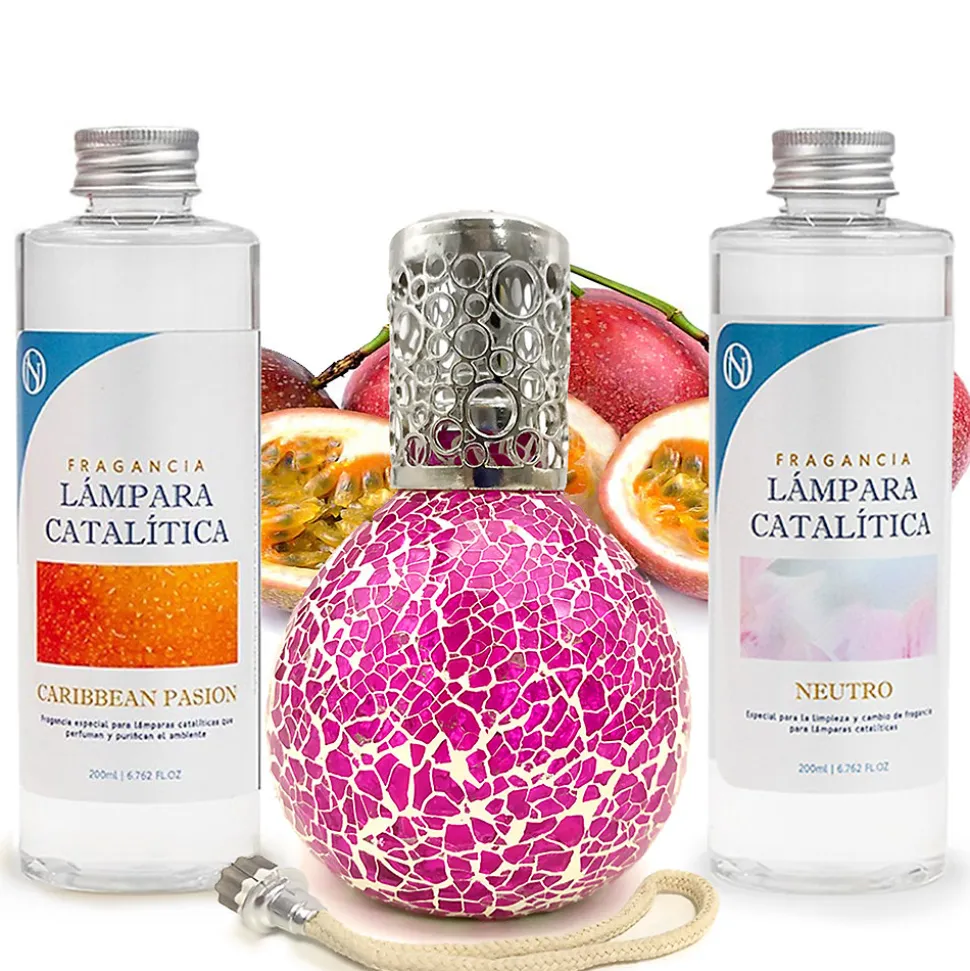 ❗ Pack économique Lampe Catalytique Mosaïque Fuchsia + Parfum Caribbean Passion 500 ml + Nettoyant Neutre 200 ml + Mèche de Rechange ❗Une lampe catalytique parfume et purifie l’air et élimine les odeurs tenaces telles que le tabac, les odeurs de cuisine, l’humidité, les odeurs d’animaux, etc. Le système de désodorisant à lampe catalytique crée non seulement un environnement parfumé, mais améliore également la qualité de l’air et embellit la pièce avec un design élégant. En seulement 20 à 30 minutes d’utilisation, la pièce sera parfumée pendant 2 heures. Lorsqu’elle est allumée, la pierre chauffe et génère une catalyse, qui décompose les particules odorantes et purifie l’environnement.⁉️ Comment utiliser une lampe catalytique ?1. REMPLIR LA LAMPE DE PARFUM : Retirez le bouchon décoratif et le capuchon et remplissez la lampe aux 3/4 avec le parfum choisi.2. PLACER LA MÈCHE DANS LA LAMPE : Insérez la mèche éteinte dans la lampe et laissez-la imprégner de parfum pendant environ 15 minutes.3. ALLUMER LA MÈCHE : À l’aide d’un briquet ou d’allumettes, allumez la mèche et laissez la flamme allumée pendant 2 minutes, jusqu’à ce qu’elle se réduise.4. ÉTEINDRE LE BRÛLEUR EN SOUFFLANT : Une fois la flamme réduite, soufflez pour l’éteindre complètement et remettez le capuchon décoratif.5. FIXER LA TÊTE DÉCORATIVE : Une fois la flamme éteinte, placez la tête décorative (avec les trous) sur la lampe à catalyse pour diffuser le parfum. Il est recommandé de l’utiliser pendant 20 à 30 minutes.6. ÉTEINDRE LA LAMPE CATALYTIQUE : Pour éteindre complètement la lampe catalytique, retirez le capuchon décoratif et remettez le capuchon métallique fermé, ce qui arrête la combustion.