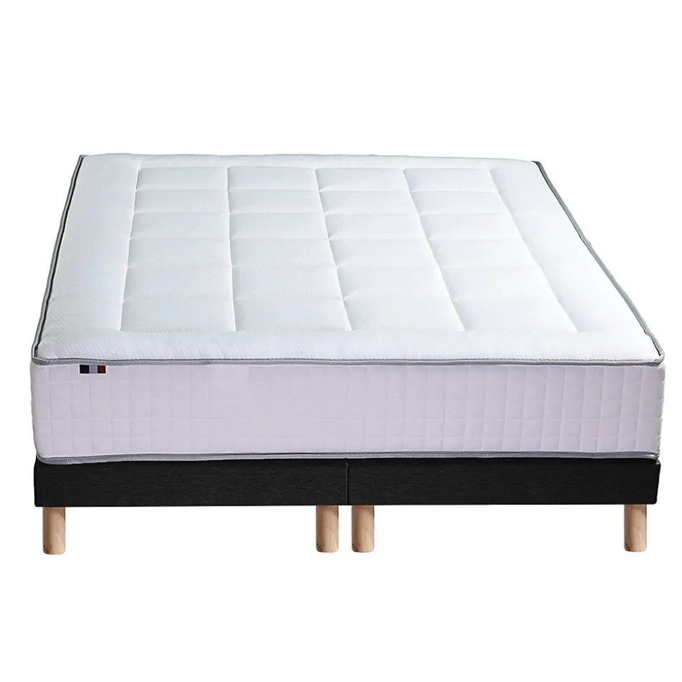ATTENTION livré avec 2 sommiers et non 1 seul (sauf pour le 140×190) Matelas PALACIO Découvrez la sensation enveloppante de ce matelas à ressorts 7 zones. Il épouse les formes de votre corps pour votre plus grand confort. Vos muscles se relâchent et une sensation d’apesanteur vous envahit pour des nuits paisibles. CARACTÉRISTIQUES MATELAS Matelas ressorts ensachés 7 zones de confort Épaisseur totale : 28 cm Soutien : Ferme Le soutien correspond au maintien du corps sur le matelas. Il est assuré par l’âme du matelas. Un matelas ferme permet de garder votre colonne vertébrale alignée. Accueil : Equilibré Ame du matelas : Ressorts ensachés Les ressorts ensachés sont emballés individuellement puis assemblés les uns aux autres. Ils s’adaptent ainsi aux mouvements du corps point par point et favorise l’indépendance de couchage. Fini les nuits perturbées par le mouvement de votre conjoint. Les ressorts permettent également une bonne qualité d’aération pour le matelas et participent ainsi à la durabilité du matelas. Nombre de ressorts : 660 ressorts en 140×190 775 ressorts ensachés en 160×200 868 ressorts ensachés en 180×200 Les ressorts sont isolés par 3 cm de mousse dessus/dessous. 7 zones de confort Profitez de 7 zones de confort différenciées pour un meilleur maintien du dos et un confort personnalisé selon les parties du corps. Zones : tête, épaule, lombaire, bassin, cuisses, jambes et pieds. Matelas réversible La face hiver : 200 g/m2 ouate hypoallergenique + 9mm de mousse (côté dessin prestige piquage carré) La face été : 200 g/m2 ouate hypoallergenique + 5mm de mousse (c